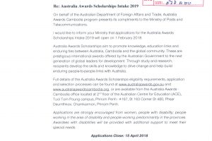 សេចក្តី​ជូន​ដំណឹង​ ស្តីពី​កម្ម​វិធី​អាហារូបករណ៍​ Australia​ Awards​ Scholarships​ ថ្នាក់​អនុ​បណ្ឌិត​ និង​បណ្ឌិត​ ឆ្នាំ​សិក្សា​ ២០១៩​