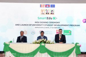 រាជធានីភ្នំពេញ៖ ព្រឹកថ្ងៃអង្គារ ៨រោច ខែភទ្របទ ឆ្នាំច សំរឹទ្ធិស័ក ព.ស.២៥៦២ ត្រូវនឹងថ្ងៃទី០២ ខែតុលា ឆ្នាំ២០១៨ នៅសណ្ឋាគាររ៉ាហ្វលឡឺរ៉ូយ៉ាល់ភ្នំពេញ ឯកឧត្ដមរដ្ឋលេខាធិការប្រចាំការ សារ៉ាក់ ខាន់ តំណាងដ៏ខ្ពង់ខ្ពស់របស់ឯកឧត្ដម ត្រាំ អ៊ីវតឹក រដ្ឋមន្ត្រីក្រសួងប្រៃសណីយ៍ និងទូរគមនាគមន៍ បានអញ្ជើញចុះហត្ថលេខាលើអនុស្សរណៈយោគយល់គ្នា “រយៈពេលបីឆ្នាំ ដើម្បីអភិវឌ្ឍអ្នកមានទេពកោសល្យ និងអ្នកដឹកនាំអាជីវកម្មឌីជីថលពេលអនាគត” ក្រោមកិច្ចសហប្រតិបត្តិការរួមរវាងក្រសួងប្រៃសណីយ៍និងទូរគមនាគមន៍ ក្រសួងអប់រំ យុវជន និងកីឡា និងក្រុមហ៊ុន Smart Axiata ។
