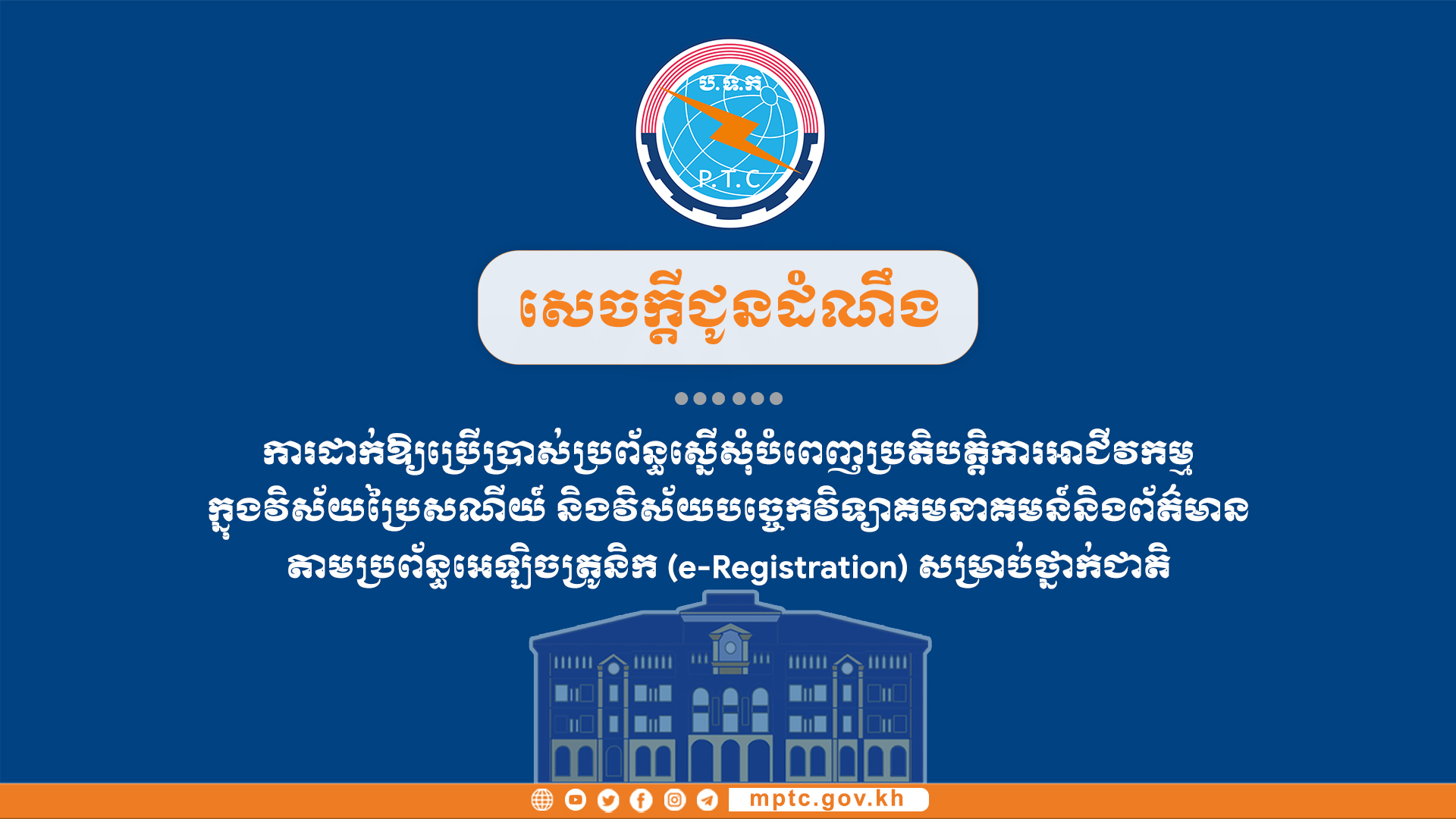 សេចក្តីជូនដំណឹង ស្តីពីការដាក់ឱ្យប្រើប្រាស់ប្រព័ន្ធស្នើសុំបំពេញប្រតិបត្តិការអាជីវកម្មក្នុងវិស័យប្រៃសណីយ៍ និងវិស័យបច្ចេកវិទ្យាគមនាគមន៍និងព័ត៌មាន តាមប្រព័ន្ធអេឡិចត្រូនិក (e-Registration) សម្រាប់ថ្នាក់ជាតិ