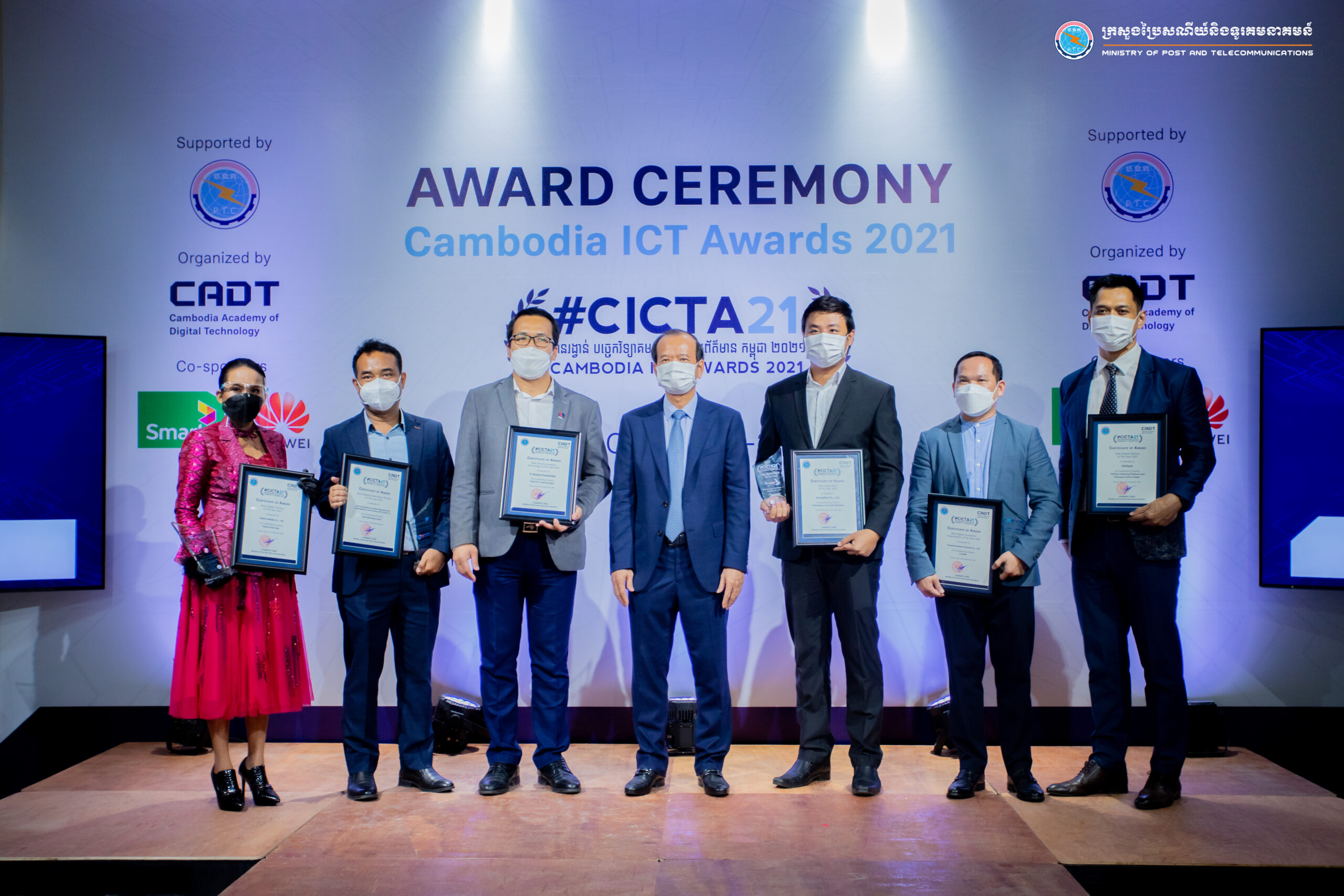 រាជធានីភ្នំពេញ៖ នៅរសៀលថ្ងៃទី៣០ ខែវិច្ឆិកា ឆ្នាំ២០២១ នៅមជ្ឈមណ្ឌលនវានុវត្តន៍ នៃបណ្ឌិត្យសភាបច្ចេកវិទ្យាឌីជីថលកម្ពុជា (CADT) ឯកឧត្តម ជា វ៉ាន់ដេត រដ្ឋមន្ត្រីក្រសួងប្រៃសណីយ៍និងទូរគមនាគមន៍ បានអញ្ជើញជាអធិបតីក្នុងពិធីប្រគល់ពានរង្វាន់បច្ចេកវិទ្យាគមនាគមន៍និងព័ត៌មាន កម្ពុជាឆ្នាំ២០២១ (Cambodia ICT Awards 2021)ដោយមានការអញ្ជីញចូលរួម តំណាងក្រសួងសេដ្ឋកិច្ចនិងហិរញ្ញវត្ថុ ក្រសួងអប់រំយុវជន និងកីឡា ក្រសួងមុខងារសាធារណៈ និងថ្នាក់ដឹកនាំពាក់ព័ន្ធក្រោមឱវាទក្រសួង CADT គ្រឹះស្ថានសិក្សា ធុរជន និងអ្នកបច្ចេកវិទ្យាជាច្រើនរូប។