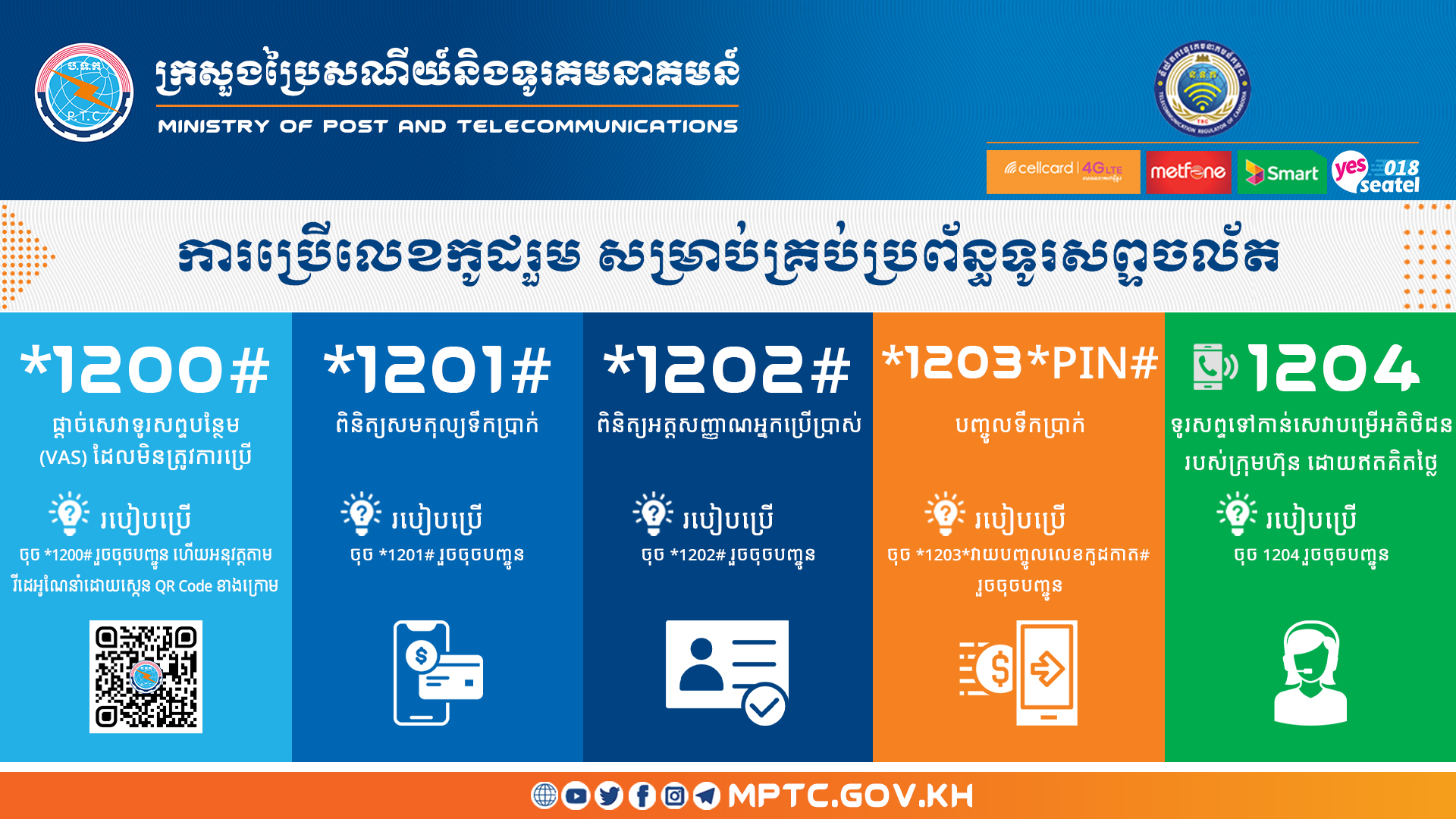 The Ministry of Post and Telecommunications would like to inform the public that, in order to provide convenience to all mobile services users, the Telecommunication Regulator of Cambodia has required all mobile network operators across the country to prepare common codes with standards according to the national telecommunications code. The codes and their functions are provided in detail as follows: