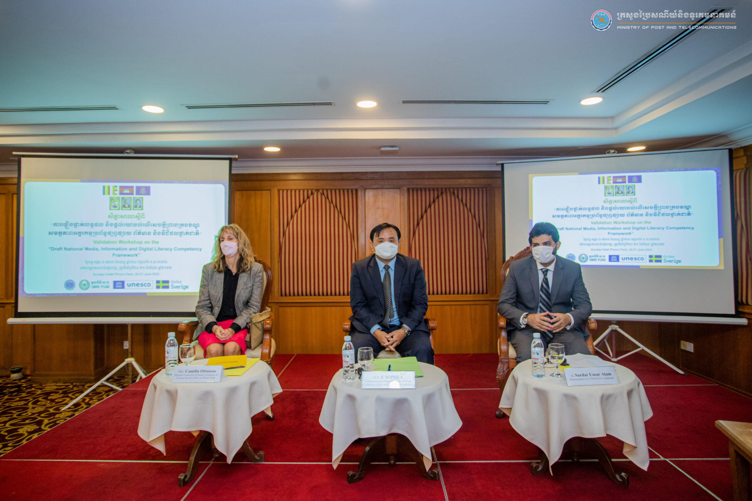 រាជធានីភ្នំពេញ៖ នាព្រឹកថ្ងៃទី២០ ខែមិថុនា ឆ្នាំ២០២២ នៅសណ្ឋាគារសាន់វ៉េភ្នំពេញ ឯកឧត្តម អេ សុភា អនុរដ្ឋលេខាធិការក្រសួងប្រៃសណីយ៍និងទូរគមនាគមន៍ បានអញ្ជើញជាអធិបតីបើកសិក្ខាសាលាស្តីពី «ការផ្ទៀងផ្ទាត់លទ្ធផល និងផ្តល់យោបល់លើសេចក្តីព្រាងក្របខណ្ឌសមត្ថភាពអក្ខរកម្មប្រព័ន្ធផ្សព្វផ្សាយ ព័ត៌មាន និងឌីជីថលថ្នាក់ជាតិ» ដោយមានការចូលរួមពីលោក Sardar Umar Alam តំណាងអង្គការយូណេស្កូប្រចាំនៅកម្ពុជា និង លោកស្រី Camilla Ottosson អគ្គទីប្រឹក្សានិងប្រធានស្ថានទូតស៊ុយអែតការិយាល័យប្រចាំនៅទីក្រុងភ្នំពេញ និងបណ្តាក្រសួង-ស្ថាប័នពាក់ព័ន្ធ គ្រឹះស្ថានអប់រំ អង្គការក្រៅរដ្ឋាភិបាល ប្រព័ន្ធផ្សព្វផ្សាយ ប្រតិបត្តិករទូរគមនាគមន៍ និងធុរកិច្ចថ្មីឌីជីថលក្នុងប្រទេស សរុបប្រមាណ ៤១នាក់ ដែលត្រូវបានកំណត់ជាតួអង្គពាក់ព័ន្ធសំខាន់ក្នុងការចូលរួមលើកកម្ពស់ និងអភិវឌ្ឍអក្ខរកម្មប្រព័ន្ធផ្សព្វផ្សាយ និងឌីជីថលនៅប្រទេសកម្ពុជា។