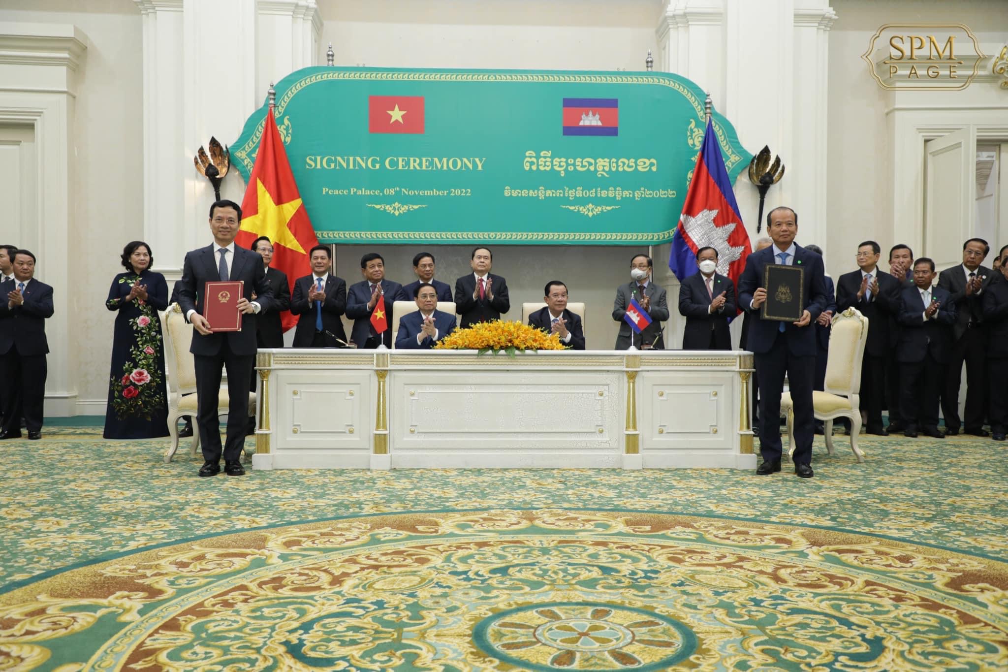 រាជធានីភ្នំពេញ៖ នាព្រឹកថ្ងៃទី៨ ខែវិច្ឆិកា ឆ្នាំ២០២២ ក្រោមអធិបតីភាពដ៏ខ្ពង់ខ្ពស់បំផុតរបស់សម្តេចអគ្គមហាសេនាបតីតេជោ ហ៊ុន សែន នាយករដ្ឋមន្ត្រីនៃព្រះរាជាណាចក្រកម្ពុជា និងឯកឧត្តម ផាម មិញជិញ នាយករដ្ឋមន្ត្រី នៃសាធារណរដ្ឋសង្គមនិយមវៀតណាម នៅវិមានសន្តិភាព ឯកឧត្តម ជា វ៉ាន់ដេត រដ្ឋមន្ត្រីក្រសួងប្រៃសណីយ៍និងទូរគមនាគមន៍ នៃព្រះរាជាណាចក្រកម្ពុជា បានអញ្ជើញចុះហត្ថលេខាលើអនុស្សរណៈនៃការយោគយល់ចំនួន២ ជាមួយឯកឧត្តម Nguyen Manh Hung រដ្ឋមន្ត្រីក្រសួងព័ត៌មាននិងគមនាគមន៍នៃសាធារណរដ្ឋសង្គមនិយមវៀតណាម និង ជាមួយអគ្គនាយកនៃក្រុមហ៊ុនវៀតធែល (ខេមបូឌា)ផងដែរ។ ពិធីនេះ ក៏មានការអញ្ជើញចូលរួមពីថ្នាក់ដឹកនាំជាន់ខ្ពស់នៃប្រទេសទាំងពីរ រួមជាមួយតំណាងស្ថាប័នជាច្រើនទៀត។
