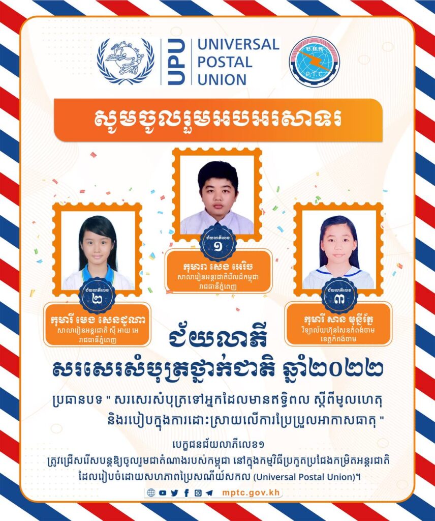 ក្រសួងប្រៃសណីយ៍និងទូរគមនាគមន៍ អបអរសាទរ និងកោតសរសើរចំពោះកុមារា និងកុមារី ចំនួន៣រូប ដែលឈ្នះការប្រកួតប្រជែងក្នុងកម្មវិធីសរសេរសំបុត្រថ្នាក់ជាតិលើកទី១ ឆ្នាំ២០២២ លើប្រធានបទ៖