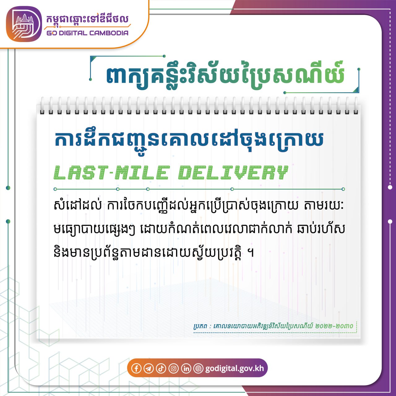 ?និយមន័យនៃពាក្យ “ការដឹកជញ្ជូនគោលដៅចុងក្រោយ (Last-Mile Delivery )” ដកស្រង់ចេញពី គោលនយោបាយអភិវឌ្ឍន៍វិស័យប្រៃសណីយ៍ ២០២២-២០៣០