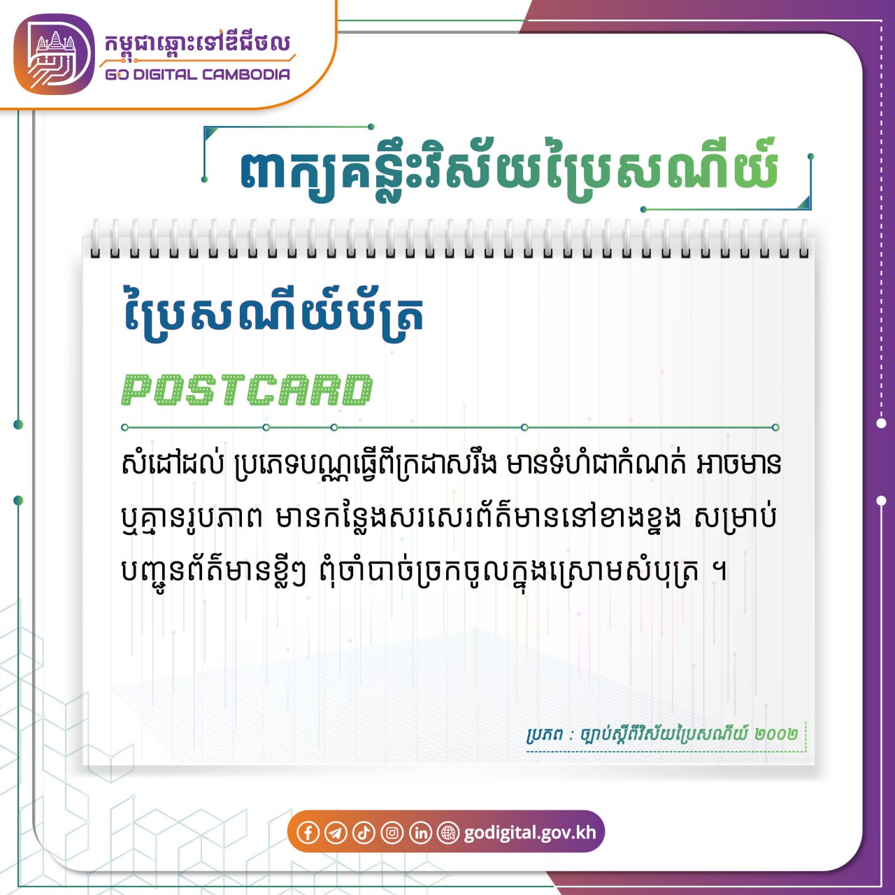 ?និយមន័យនៃពាក្យ “ប្រៃសណីយ៍ប័ត្រ (Postcard )” ដកស្រង់ចេញពី ច្បាប់ស្ដីពីវិស័យប្រៃសណីយ៍ ២០០២
