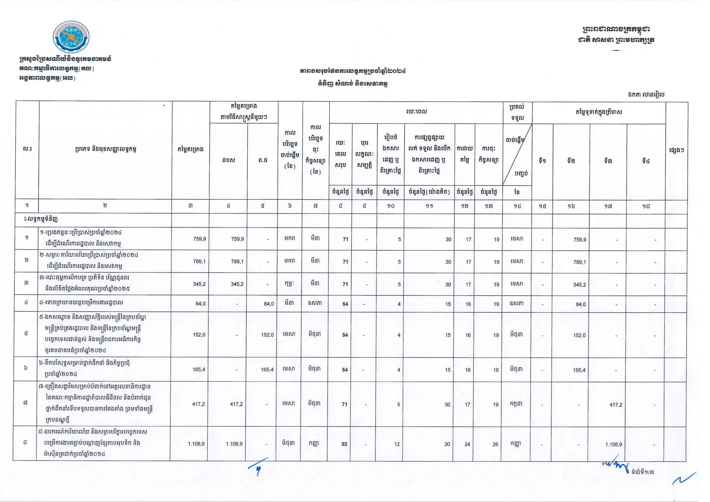 សេចក្តីជូនដំណឹង ស្តីពី តារាងសរុបផែនការលទ្ធកម្មប្រចាំឆ្នាំ២០២៤ ទំនិញ សំណង់ និងសេវាកម្ម របស់ក្រសួងប្រៃសណីយ៍និងទូរគមនាគមន៍