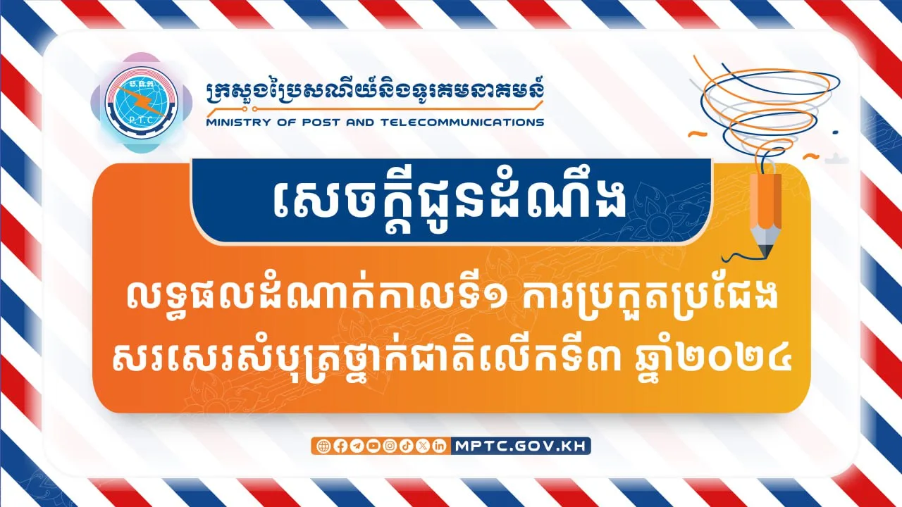 ក្រសួងប្រៃសណីយ៍និងទូរគមនាគមន៍ មានកិត្តិយសសូមជម្រាបជូនសាធារណជន និងសិស្សានុសិស្សដែល បានចូលរួមប្រកួតប្រជែងក្នុងកម្មវិធីសរសេរសំបុត្រថ្នាក់ជាតិលើកទី៣ ឆ្នាំ២០២៤ មេត្តាជ្រាបថា ក្រោយពីគណៈកម្មការ បានវាយតម្លៃយ៉ាងយកចិត្តទុកដាក់លើសំណេររបស់បេក្ខជនចំនួន ១៤៧រូប ដែលបានចូលរួមប្រកួតប្រជែងរួចមក គណៈកម្មការបានសម្រេចជ្រើសរើសបេក្ខជនចំនួន ១០រូប ជាបេក្ខជនជ័យលាភីក្នុងដំណាក់កាលទី១ ដោយសំណេរ ទាំងនេះ មានខ្លឹមសារល្អ និងទទួលបានពិន្ទុខ្ពស់។
