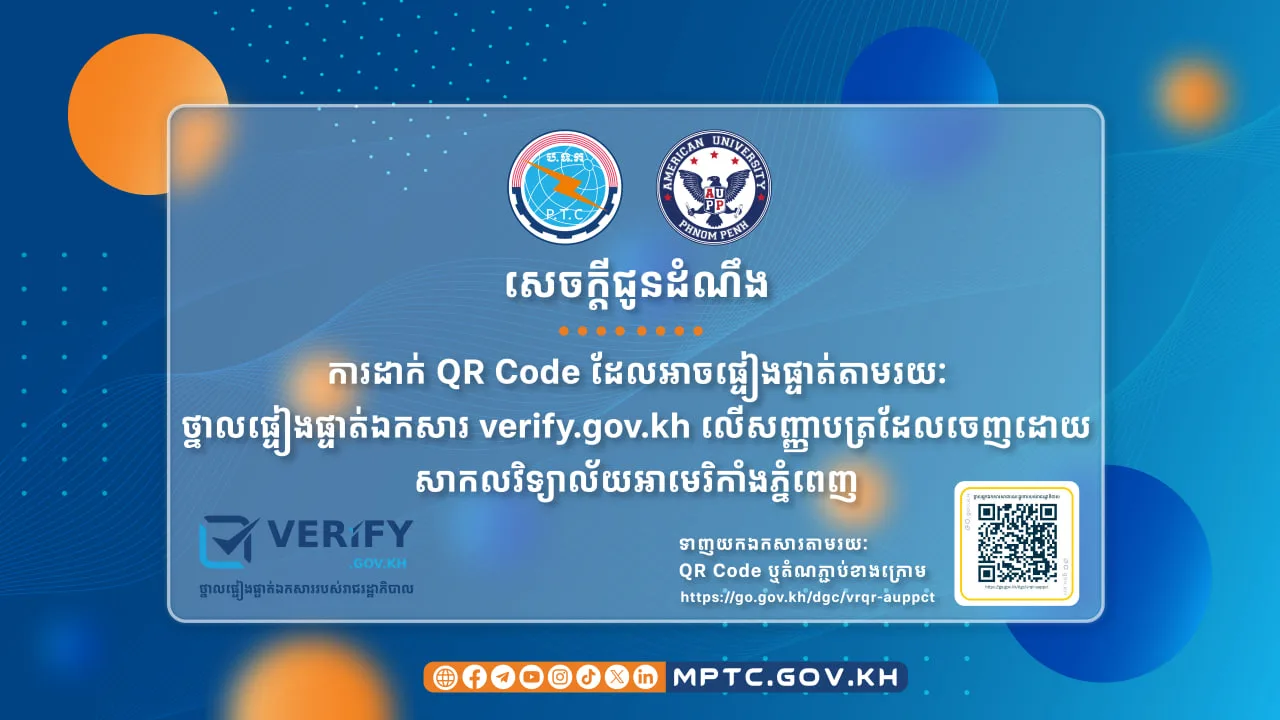 ក្រសួងប្រៃសណីយ៍និងទូរគមនាគមន៍ (ក.ប.ទ.) និងសាកលវិទ្យាល័យអាមេរិកាំងភ្នំពេញ (ស.អ.ភ.) សូមជម្រាបជូននិស្សិត និងសាធារណជនទាំងអស់មេត្តាជ្រាបថា បន្ទាប់ពីចុះកិច្ចព្រមព្រៀងស្ដីពីកិច្ចសហប្រតិបត្តិការ ក្នុងការដាក់ឱ្យប្រើថ្នាលផ្ទៀងផ្ទាត់ឯកសារ verify.gov.kh រវាង ក.ប.ទ. និង ស.អ.ភ. ដើម្បីដាក់បញ្ចូល QR Code ដែលអាចផ្ទៀងផ្ទាត់តាមរយៈ “ថ្នាលផ្ទៀងផ្ទាត់ឯកសារ verify.gov.kh” លើសញ្ញាបត្រដែលចេញដោយ ស.អ.ភ. ក្រុមការងារជំនាញបានសហការក្នុងការរៀបចំប្រព័ន្ធនិងបានបញ្ចប់រួចរាល់នូវការដាក់បញ្ចូល QR Code រួមមានដូចខាងក្រោម៖