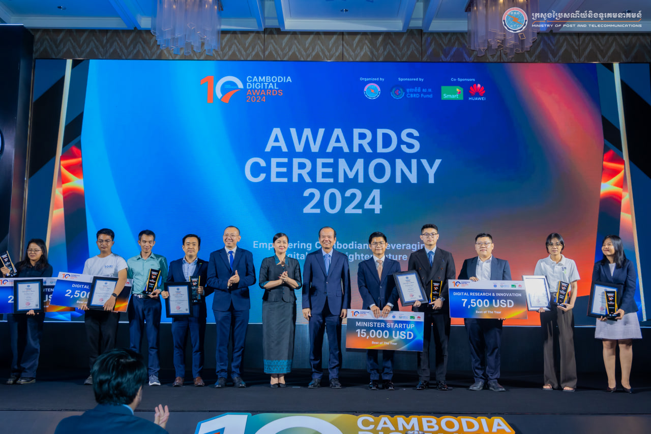 រាជធានីភ្នំពេញ៖ នៅល្ងាចថ្ងៃទី២៩ ខែវិច្ឆិកា ឆ្នាំ២០២៤ ឯកឧត្តម ជា វ៉ាន់ដេត រដ្ឋមន្ត្រីក្រសួងប្រៃសណីយ៍និងទូរគមនាគមន៍(ក.ប.ទ.) បានអញ្ជើញជាអធិបតីក្នុងពិធីប្រគល់ពានរង្វាន់ឌីជីថលកម្ពុជាឆ្នាំ២០២4 (Cambodia Digital Awards 2024) ដែលជាខួប១០ឆ្នាំ ក្រោមប្រធានបទ “គាំទ្រដល់ពលរដ្ឋកម្ពុជាក្នុងការប្រើប្រាស់បច្ចេកវិទ្យាឌីជីថល ដើម្បីអនាគតកាន់តែល្អប្រសើរ” នៅសណ្ឋាគារ ហៃយ៉ាត់ រីជិនស៊ី ភ្នំពេញ។ ពិធីនេះមានការអញ្ជីញចូលរួមពីថ្នាក់ដឹកនាំក្រោមឱវាទក្រសួង បណ្ឌិត្យសភាបច្ចេកវិទ្យាឌីជីថលកម្ពុជា ក្រសួង ស្ថាប័ន ក្រុមហ៊ុនឯកជន ធុរកិច្ចថ្មីឌីជីថល សហគ្រិន និងអ្នកជំនាញបច្ចេកវិទ្យាជាច្រើនរូបសរុបប្រមាន សរុបប្រមាណ ២១០នាក់។