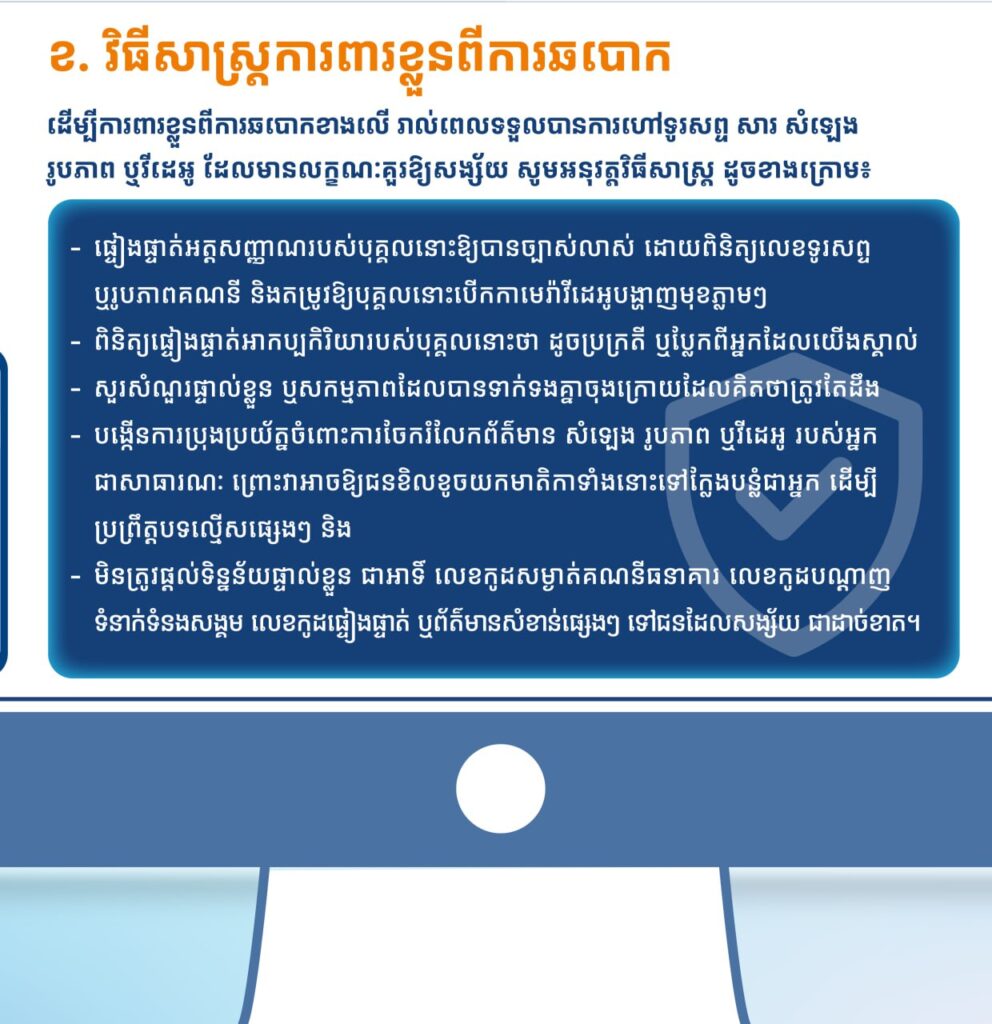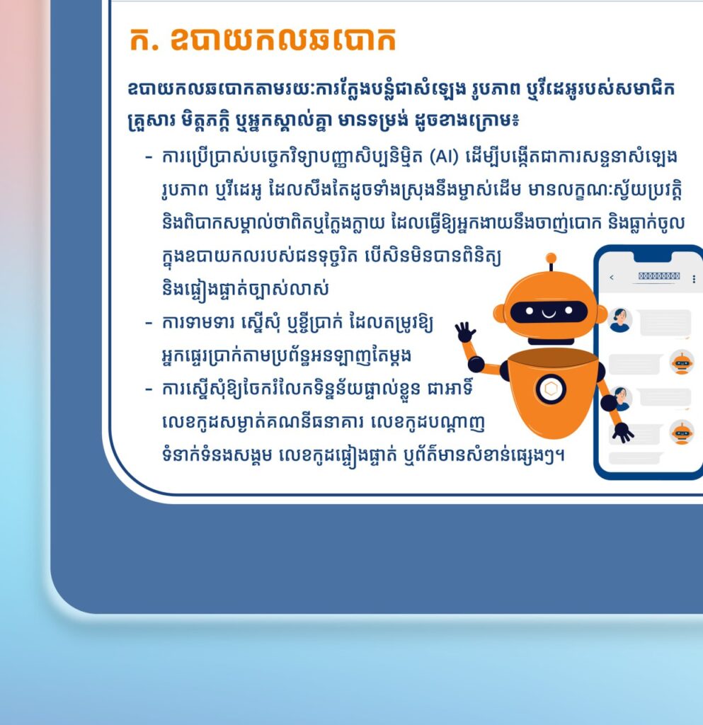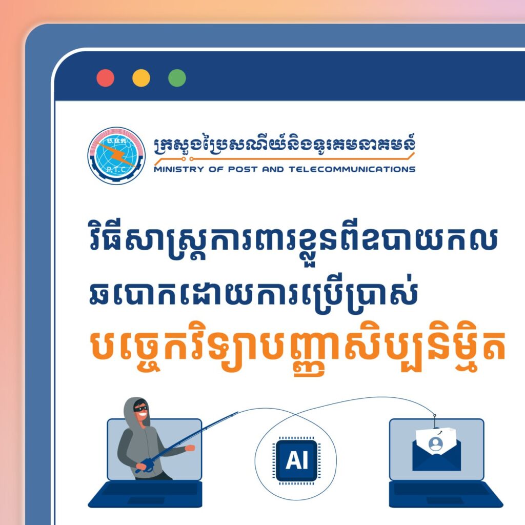 ក្រសួងប្រៃសណីយ៍និងទូរគមនាគមន៍ (ក.ប.ទ.) សូមជម្រាបជូនសាធារណជនទាំងអស់មេត្តាជ្រាបថា ស្របពេលដែលបច្ចេកវិទ្យាកំពុងអភិវឌ្ឍឥតឈប់ឈរ ការឆបោកកាន់តែមានច្រើនដែលជាបញ្ហាសកលកំពុងកើនឡើងគួរឱ្យកត់សម្គាល់។ ថ្មីៗនេះ ក្រុមឆបោកបានប្រើប្រាស់បច្ចេកវិទ្យាបញ្ញាសិប្បនិម្មិត (AI) ក្នុងការបោកប្រាស់ តាមប្រព័ន្ធទូរសព្ទ ក៏ដូចជាប្រព័ន្ធទូរគមនាគមន៍ផ្សេងៗ ដើម្បីឱ្យអ្នកផ្ទេរប្រាក់ឬចែករំលែកទិន្នន័យសំខាន់ៗមួយចំនួន ដោយក្លែងបន្លំជាការសន្ទនាសំឡេង រូបភាព ឬវីដេអូដែលមានមុខមាត់ពិតរបស់សមាជិកគ្រួសារ មិត្តភក្តិ ឬអ្នកស្គាល់គ្នា ដែលធ្វើឱ្យមានការពិបាកក្នុងការកំណត់អត្តសញ្ញាណថាពិត ឬក្លែងក្លាយ។