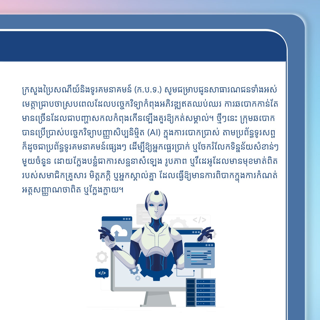 ក្រសួងប្រៃសណីយ៍និងទូរគមនាគមន៍ (ក.ប.ទ.) សូមជម្រាបជូនសាធារណជនទាំងអស់មេត្តាជ្រាបថា ស្របពេលដែលបច្ចេកវិទ្យាកំពុងអភិវឌ្ឍឥតឈប់ឈរ ការឆបោកកាន់តែមានច្រើនដែលជាបញ្ហាសកលកំពុងកើនឡើងគួរឱ្យកត់សម្គាល់។ ថ្មីៗនេះ ក្រុមឆបោកបានប្រើប្រាស់បច្ចេកវិទ្យាបញ្ញាសិប្បនិម្មិត (AI) ក្នុងការបោកប្រាស់ តាមប្រព័ន្ធទូរសព្ទ ក៏ដូចជាប្រព័ន្ធទូរគមនាគមន៍ផ្សេងៗ ដើម្បីឱ្យអ្នកផ្ទេរប្រាក់ឬចែករំលែកទិន្នន័យសំខាន់ៗមួយចំនួន ដោយក្លែងបន្លំជាការសន្ទនាសំឡេង រូបភាព ឬវីដេអូដែលមានមុខមាត់ពិតរបស់សមាជិកគ្រួសារ មិត្តភក្តិ ឬអ្នកស្គាល់គ្នា ដែលធ្វើឱ្យមានការពិបាកក្នុងការកំណត់អត្តសញ្ញាណថាពិត ឬក្លែងក្លាយ។