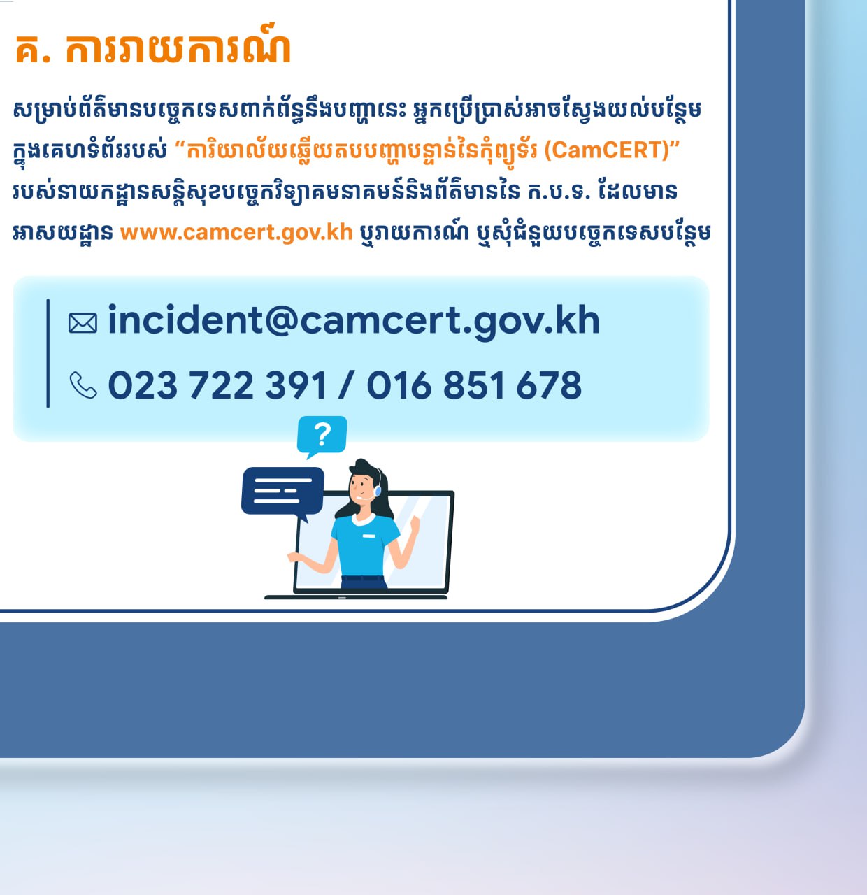 សម្រាប់ព័ត៌មានបច្ចេកទេសពាក់ព័ន្ធនឹងបញ្ហានេះ អ្នកប្រើប្រាស់អាចស្វែងយល់បន្ថែមក្នុងគេហទំព័ររបស់ “ការិយាល័យឆ្លើយតបបញ្ហាបន្ទាន់នៃកុំព្យូទ័រ (CamCERT)” របស់នាយកដ្ឋានសន្តិសុខបច្ចេកវិទ្យាគមនាគមន៍និងព័ត៌មាននៃ ក.ប.ទ. ដែលមានអាសយដ្ឋាន www.camcert.gov.kh ឬរាយការណ៍ ឬសុំជំនួយបច្ចេកទេសបន្ថែម តាមរយៈអ៊ីមែល incident@camcert.gov.kh ឬទូរសព្ទលេខ 023 722 391 / ០១៦ ៨៥១ ៦៧៨។