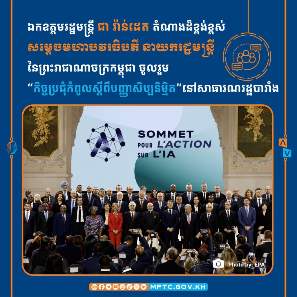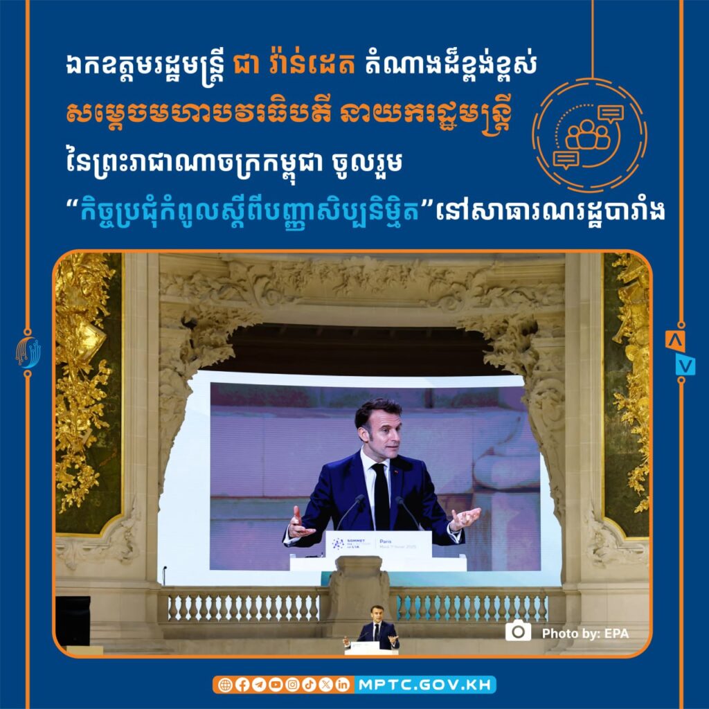 ប៉ារីស៖ តបតាមការអញ្ជើញរបស់ឯកឧត្តម អេម៉ានុយអែល ម៉ាក្រុង ប្រធានាធិបតីនៃសាធារណរដ្ឋបារាំង ឯកឧត្ដម ជា វ៉ាន់ដេត រដ្ឋមន្ត្រីក្រសួងប្រៃសណីយ៍និងទូរគមនាគមន៍ តំណាងដ៏ខ្ពង់ខ្ពស់ សម្ដេចមហាបវរធិបតី ហ៊ុន ម៉ាណែត នាយករដ្ឋមន្ត្រីនៃព្រះរាជាណាចក្រកម្ពុជា បានអញ្ជើញចូលរួម “កិច្ចប្រជុំកំពូលស្ដីពីបញ្ញាសិប្បនិម្មិត” នៅក្រុងប៉ារីស សាធារណរដ្ឋបារាំង នៅថ្ងៃទី១០-១១ ខែកុម្ភៈ ឆ្នាំ២០២៥ ដោយមានការអញ្ជើញចូលរួមពីប្រមុខរដ្ឋ ប្រមុខរដ្ឋាភិបាល រដ្ឋមន្ត្រីទទួលបន្ទុកវិស័យឌីជីថល និងឥស្សរជនតំណាងប្រទេសចំនួន ១០០ប្រទេស ព្រមទាំងក្រុមហ៊ុនបច្ចេកវិទ្យាធំៗ មជ្ឈដ្ឋានសិក្សានិងស្រាវជ្រាវ និងអង្គការអន្តរជាតិជាច្រើន ដែលមានអ្នកចូលរួមសរុបប្រមាណ ១,៥០០នាក់។