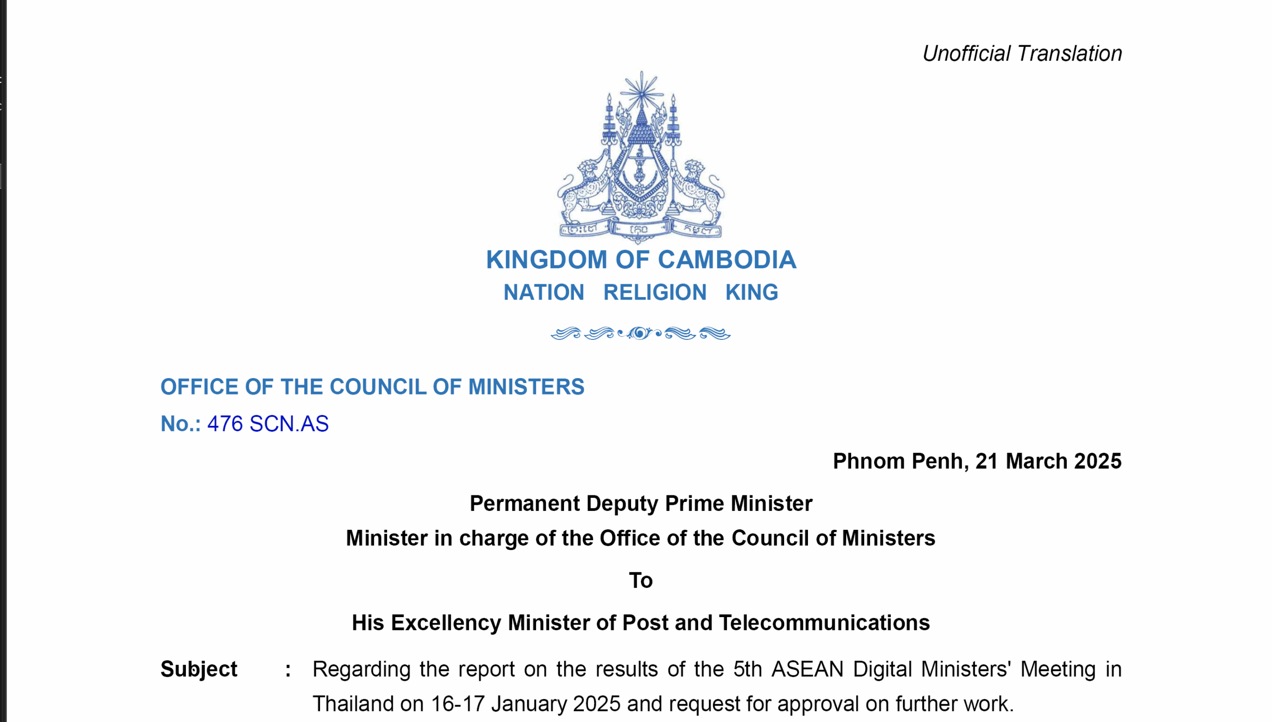 សេចក្តីជូនដំណឹង លេខ ៤៧៦ សជណ.អស៊ ស្តីពីលទ្ធផលនៃការចូលរួមកិច្ចប្រជុំរដ្ឋមន្ត្រីឌីជីថលអាស៊ានលើកទី៥ នៅប្រទេសថៃ នៅថ្ងៃទី១៦-១៧ ខែមករា ឆ្នាំ២០២៥ និងសំណើគោរពសុំគោលការណ៍លើការងារបន្ត
