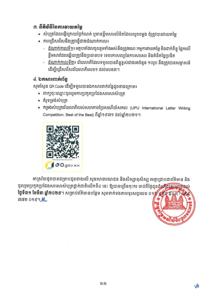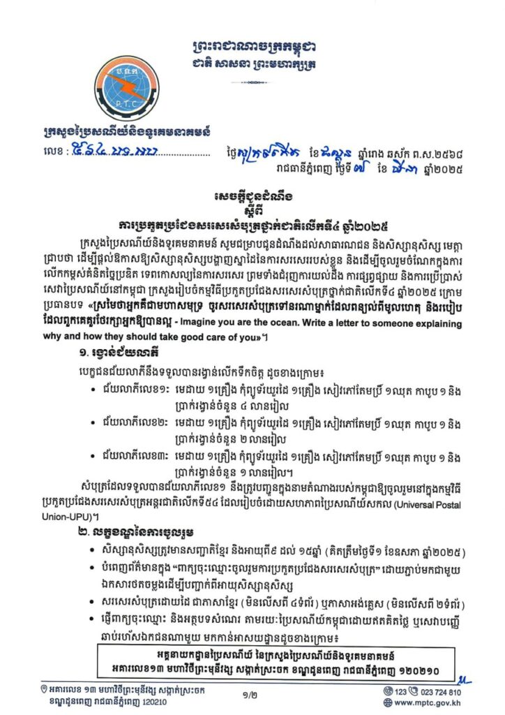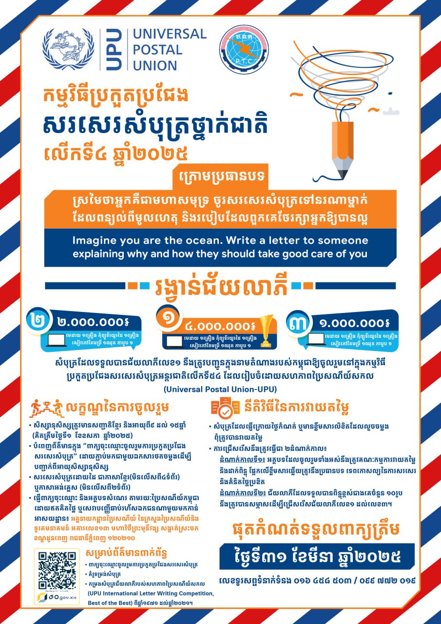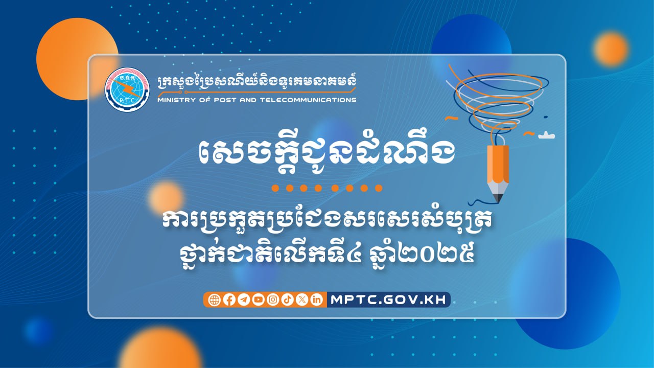 ក្រសួងប្រៃសណីយ៍និងទូរគមនាគមន៍ សូមជម្រាបជូនដំណឹងដល់សាធារណជនទាំងអស់មេត្តាជ្រាបថា ដើម្បីផ្តល់ឱកាសឱ្យសិស្សានុសិស្សបង្ហាញស្នាដៃនៃការសរសេររបស់ខ្លួន និងដើម្បីចូលរួមចំណែកក្នុងការលើកកម្ពស់គំនិតច្នៃប្រឌិត ទេព្យកោសល្យនៃការសរសេរ ព្រមទាំងជំរុញការយល់ដឹង និងការប្រើប្រាស់សេវាប្រៃសណីយ៍នៅកម្ពុជា។ ក្រសួងបានរៀបចំកម្មវិធីប្រកួតប្រជែងសរសេរសំបុត្រថ្នាក់ជាតិលើកទី៤ ឆ្នាំ២០២៥ ក្រោមប្រធានបទ៖