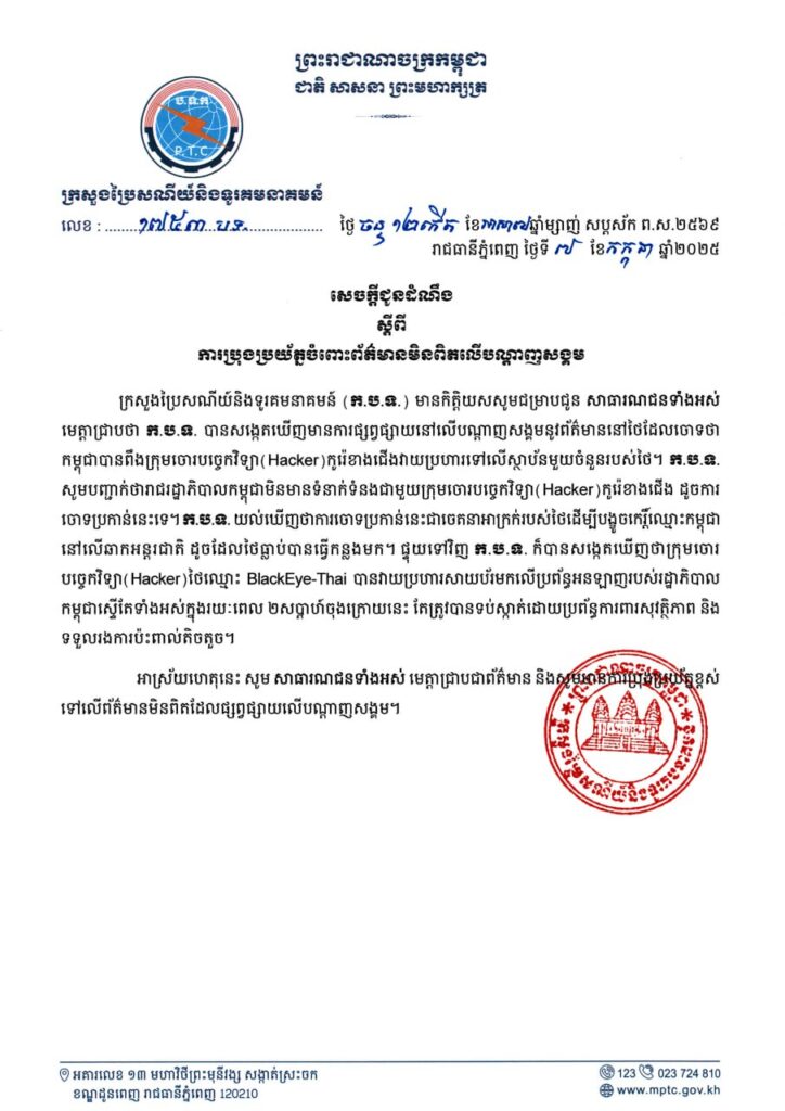 ក្រសួងប្រៃសណីយ៍និងទូរគមនាគមន៍ (ក.ប.ទ.) មានកិត្តិយសសូមជម្រាបជូន សាធារណជនទាំងអស់ មេត្តាជ្រាបថា ក.ប.ទ. បានសង្កេតឃើញមានការផ្សព្វផ្សាយនៅលើបណ្តាញសង្គមនូវព័ត៌មាននៅថៃដែលចោទថាកម្ពុជាបានពឹងក្រុមចោរបច្ចេកវិទ្យា(Hacker)កូរ៉េខាងជើងវាយប្រហារទៅលើស្ថាប័នមួយចំនួនរបស់ថៃ។ ក.ប.ទ. សូមបញ្ជាក់ថារាជរដ្ឋាភិបាលកម្ពុជាមិនមានទំនាក់ទំនងជាមួយក្រុមចោរបច្ចេកវិទ្យា (Hacker) កូរ៉េខាងជើង ដូចការចោទប្រកាន់នេះទេ។ ក.ប.ទ. យល់ឃើញថាការចោទប្រកាន់នេះជាចេតនាអាក្រក់របស់ថៃដើម្បីបង្ខូចកេរ្តិ៍ឈ្មោះកម្ពុជានៅលើឆាកអន្តរជាតិ ដូចដែលថៃធ្លាប់បានធ្វើកន្លងមក។ ផ្ទុយទៅវិញ ក.ប.ទ. ក៏បានសង្កេតឃើញថាក្រុមចោរបច្ចេកវិទ្យា(Hacker)ថៃឈ្មោះ BlackEye-Thai បានវាយប្រហារសាយប័រមកលើប្រព័ន្ធអនឡាញរបស់រដ្ឋាភិបាលកម្ពុជាស្ទើតែទាំងអស់ក្នុងរយៈពេល ២សប្តាហ៍ចុងក្រោយនេះ តែត្រូវបានទប់ស្កាត់ដោយប្រព័ន្ធការពារសុវត្ថិភាព និងទទួលរងការប៉ះពាល់តិចតួច។