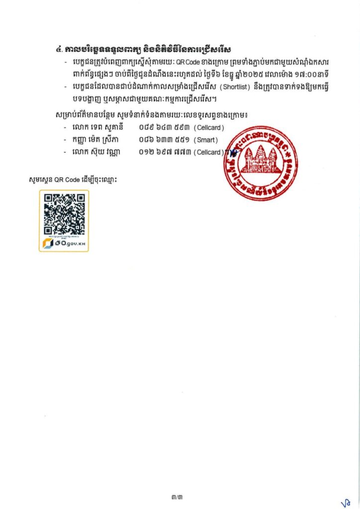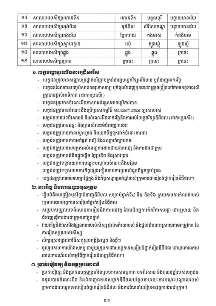 ក្រសួងប្រៃសណីយ៍និងទូរគមនាគមន៍ (ក.ប.ទ.) សូមជម្រាបជូនសាធារណជន និស្សិតដែលបានបញ្ចប់ការសិក្សា និងលោកគ្រូអ្នកគ្រូ មេត្តាជ្រាបថា ដោយទទួលបានភាពជោគជ័យលើជំហានទី១ នៃការរៀបចំនិងអនុវត្តកម្មវិធីថ្នាក់រៀនជំនាញឌីជីថលនៅតាមសាលាគោលដៅចំនួន៤២ ក្នុងរាជធានី-ខេត្តចំនួន៩ ដែលជាការអនុវត្តវិធានការគន្លឹះក្នុងវិស័យអប់រំរបស់រាជរដ្ឋាភិបាលនីតិកាលទី៧ នៃរដ្ឋសភា ក.ប.ទ. ត្រូវការជ្រើសរើសបុគ្គលិកជាប់កិច្ចសន្យាបន្ថែមចំនួន១៩រូប ដើម្បីបង្រៀនថ្នាក់ជំនាញឌីជីថលដល់សិស្សានុសិស្សថ្នាក់ទី៤ ទី៥ និងទី៦ ដែលគ្រោងនឹងពង្រីកទៅកាន់សាលាបឋមសិក្សាគោលដៅ ១៩ទីតាំងបន្ថែម សម្រាប់ឆ្នាំសិក្សា២០២៥-២០២៦ ក្នុងខេត្តចំនួន ១៤។