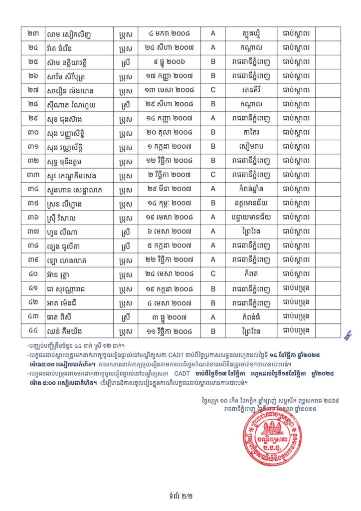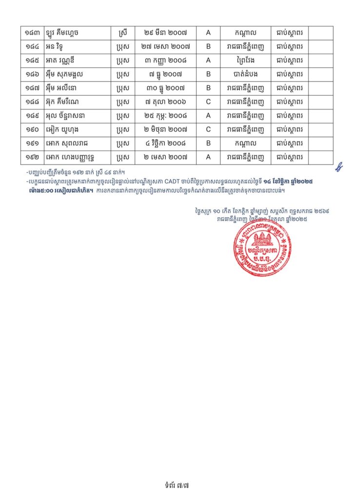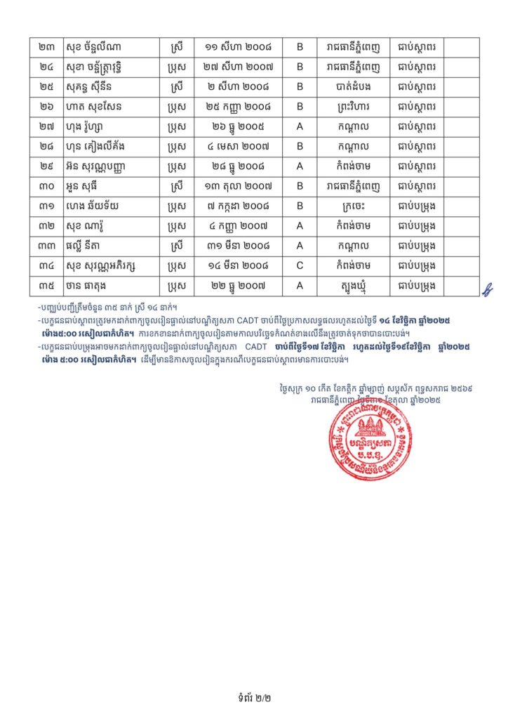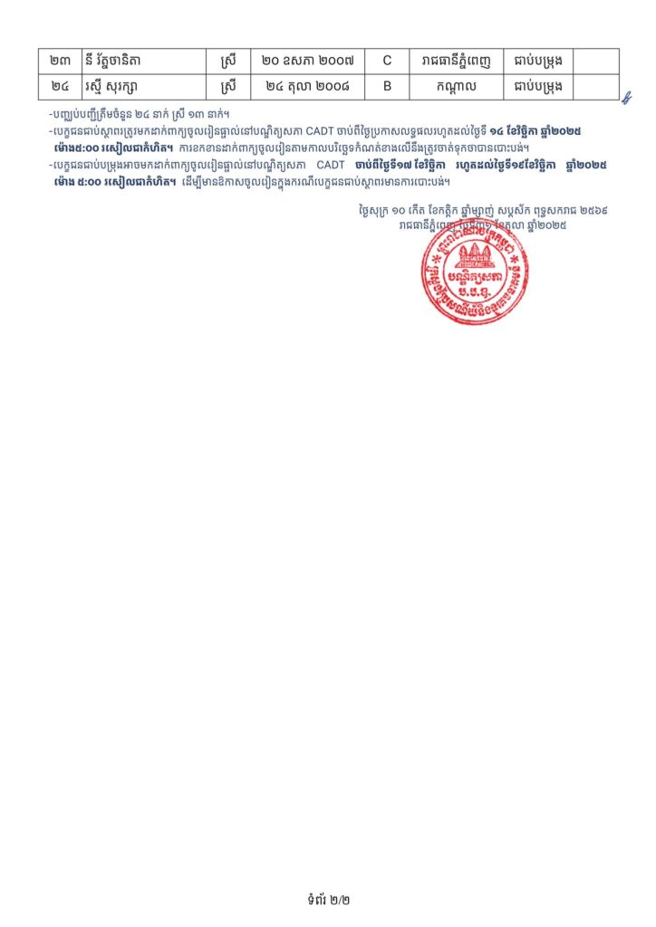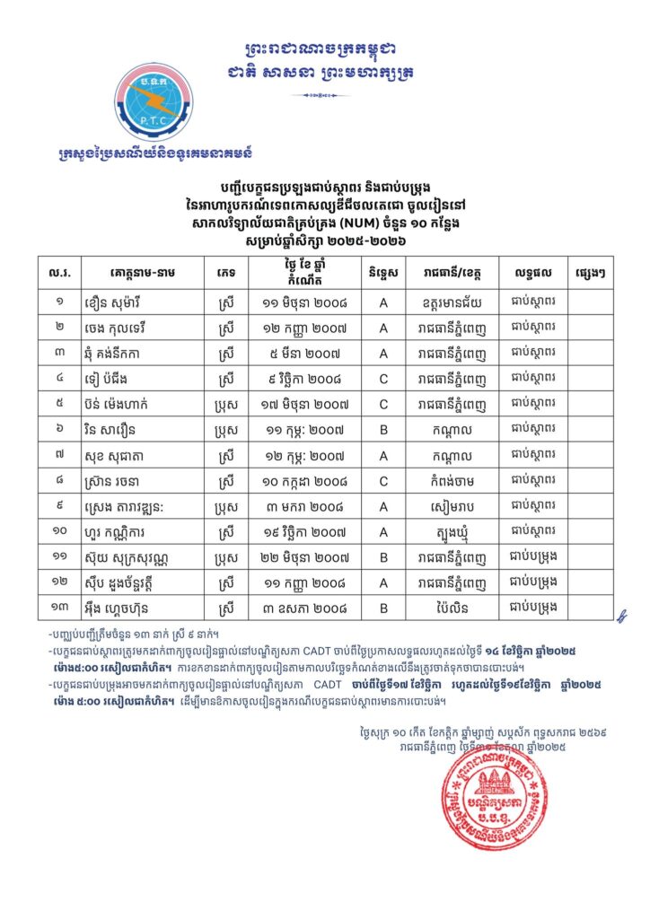 -បេក្ខជនជាប់ជាស្ថាពរទាំងអស់ ដែលត្រូវសិក្សានៅបណ្ឌិត្យសភាបច្ចេកវិទ្យាឌីជីថលកម្ពុជា (CADT), សាកលវិទ្យាល័យភូមិន្ទភ្នំពេញ (RUPP), វិទ្យាស្ថានបច្ចេកវិទ្យាកម្ពុជា (ITC), សាកលវិទ្យាល័យជាតិគ្រប់គ្រង (NUM), និង សាកលវិទ្យាល័យអន្តរជាតិផារ៉ាហ្គន (Paragon.U) ត្រូវមកដាក់ពាក្យចូលរៀនផ្ទាល់នៅបណ្ឌិត្យសភាបច្ចេកវិទ្យាឌីជីថលកម្ពុជា (CADT) ចាប់ពីថ្ងៃប្រកាសលទ្ធផលរហូតដល់ថ្ងៃទី១៤ ខែវិច្ឆិកា ឆ្នាំ២០២៥ ម៉ោង៥:០០ នាទីរសៀលជាកំហិត។ ការខកខានដាក់ពាក្យចូលរៀនតាមកាលបរិច្ឆេទកំណត់ខាងលើនឹងត្រូវចាត់ទុកថាបានបោះបង់។