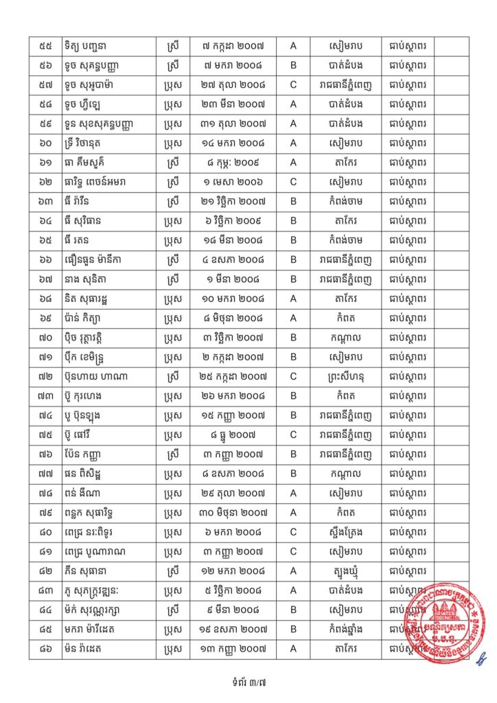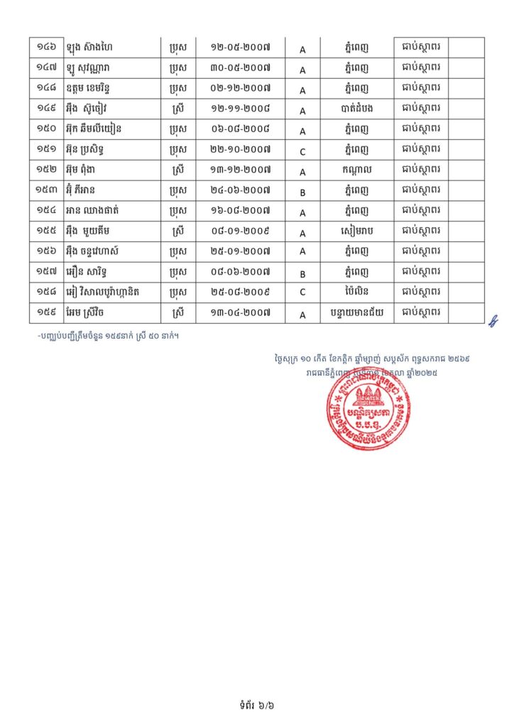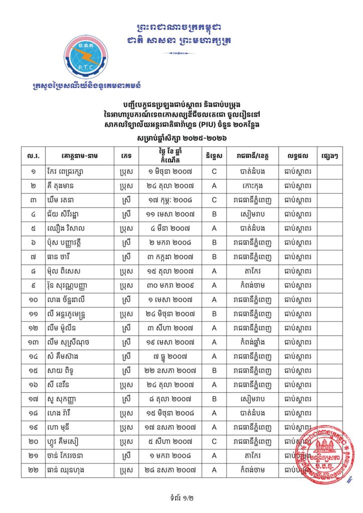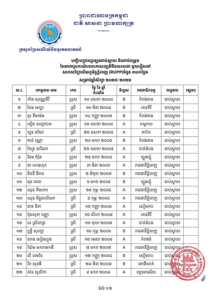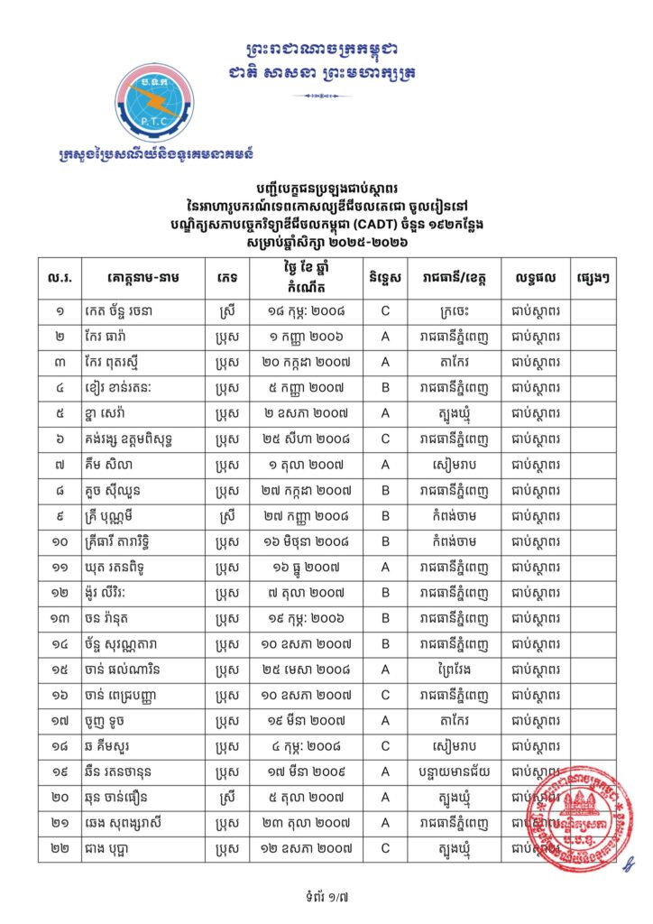 -បេក្ខជនជាប់ជាស្ថាពរទាំងអស់ ដែលត្រូវសិក្សានៅបណ្ឌិត្យសភាបច្ចេកវិទ្យាឌីជីថលកម្ពុជា (CADT), សាកលវិទ្យាល័យភូមិន្ទភ្នំពេញ (RUPP), វិទ្យាស្ថានបច្ចេកវិទ្យាកម្ពុជា (ITC), សាកលវិទ្យាល័យជាតិគ្រប់គ្រង (NUM), និង សាកលវិទ្យាល័យអន្តរជាតិផារ៉ាហ្គន (Paragon.U) ត្រូវមកដាក់ពាក្យចូលរៀនផ្ទាល់នៅបណ្ឌិត្យសភាបច្ចេកវិទ្យាឌីជីថលកម្ពុជា (CADT) ចាប់ពីថ្ងៃប្រកាសលទ្ធផលរហូតដល់ថ្ងៃទី១៤ ខែវិច្ឆិកា ឆ្នាំ២០២៥ ម៉ោង៥:០០ នាទីរសៀលជាកំហិត។ ការខកខានដាក់ពាក្យចូលរៀនតាមកាលបរិច្ឆេទកំណត់ខាងលើនឹងត្រូវចាត់ទុកថាបានបោះបង់។