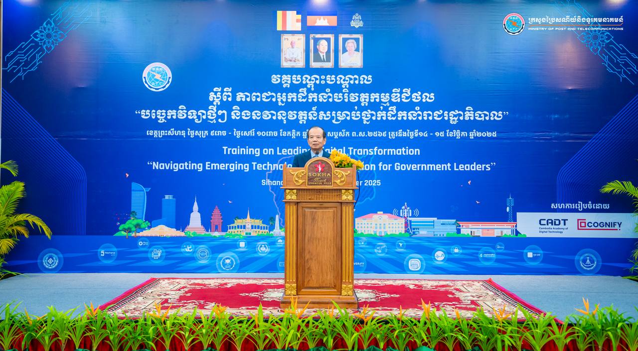 រាជធានីភ្នំពេញ៖ ព្រឹកថ្ងៃទី១៤ ខែវិច្ឆិកា ឆ្នាំ២០២៥ ឯកឧត្តម ជា វ៉ាន់ដេត រដ្ឋមន្ត្រីក្រសួងប្រៃសណីយ៍និងទូរគមនាគមន៍ (ក.ប.ទ.) បានអញ្ជើញជាអធិបតីក្នុងពិធីបើកវគ្គបណ្តុះបណ្តាលកម្រិតខ្ពស់ស្ដីពីភាពជាអ្នកដឹកនាំបរិវត្តកម្មឌីជីថល “បច្ចេកវិទ្យាថ្មីៗ និងនវានុវត្តន៍សម្រាប់ថ្នាក់ដឹកនាំរាជរដ្ឋាភិបាល” ដល់ថ្នាក់ដឹកនាំជារដ្ឋលេខាធិការប្រចាំការក្រសួង ស្ថាប័ន ក្នុងរាជរដ្ឋាភិបាល នៅសណ្ឋាគារសុខាឆ្នេរសុខា ខេត្តព្រះសីហនុ។