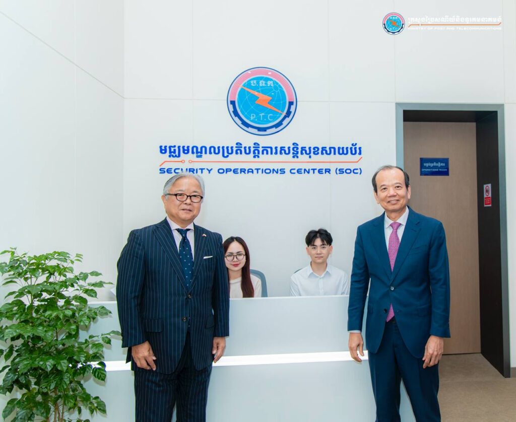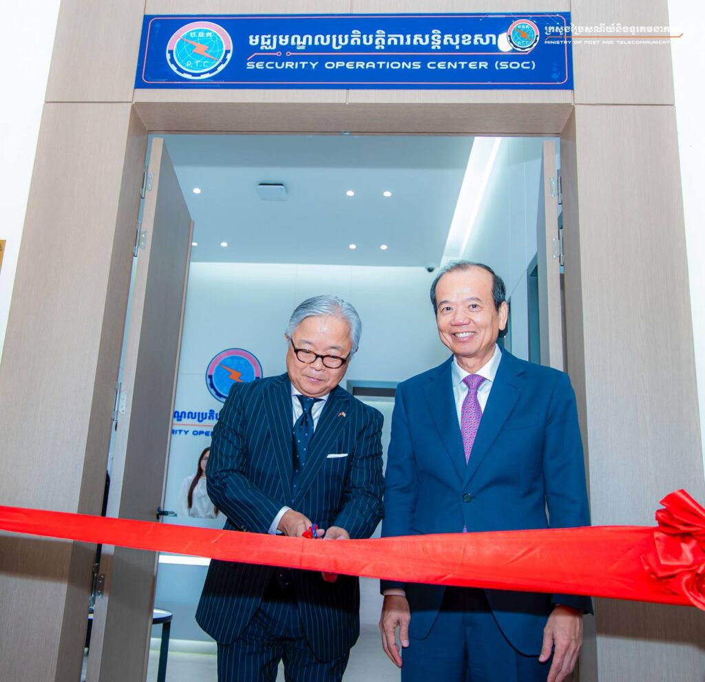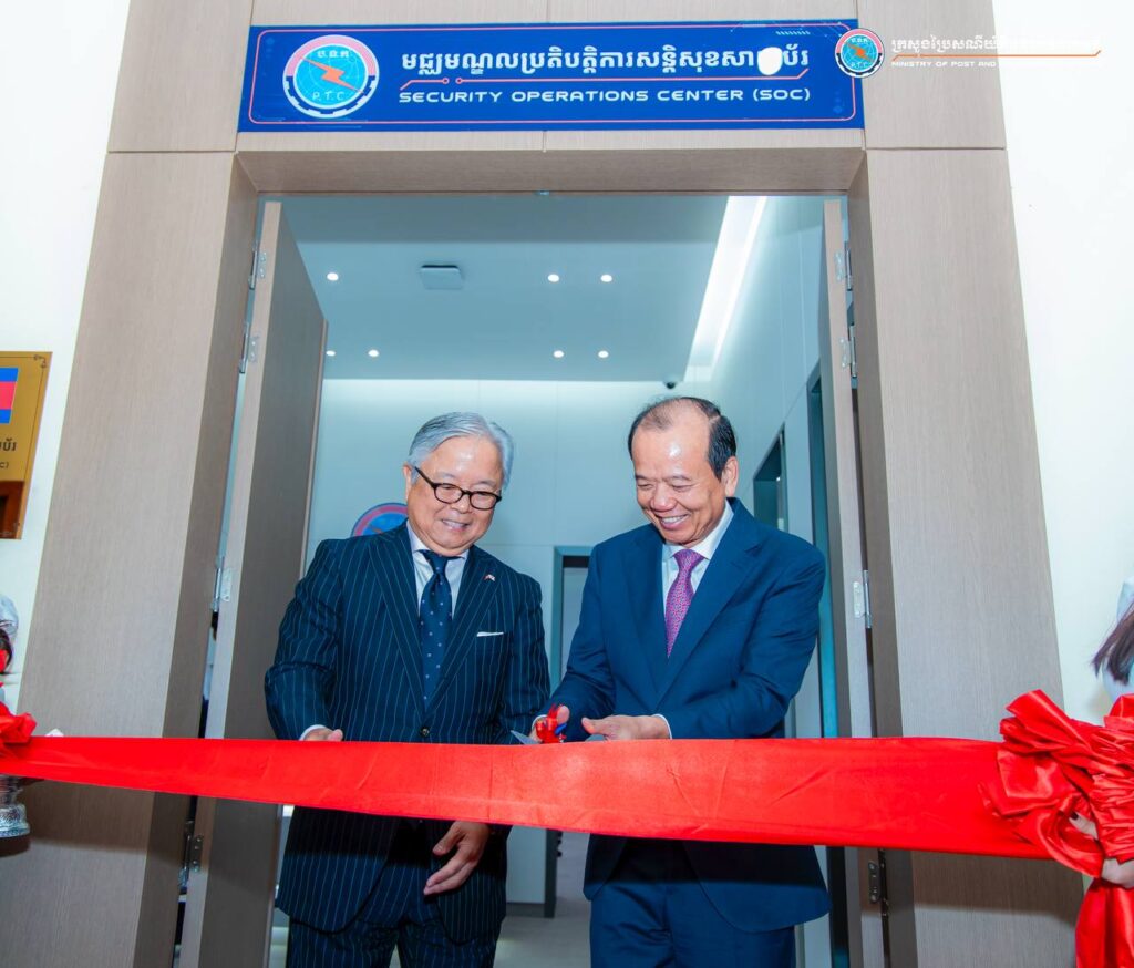 រាជធានីភ្នំពេញ៖ ព្រឹកថ្ងៃទី២០ ខែវិច្ឆិកា ឆ្នាំ២០២៥ ឯកឧត្តម ជា វ៉ាន់ដេត រដ្ឋមន្រ្តីក្រសួងប្រៃសណីយ៍និងទូរគមនាគមន៍ (ក.ប.ទ.) និងឯកឧត្តម អាត់ស៊ូស៊ី អ៊ូអិណូ (Atsushi UENO) ឯកអគ្គរាជទូតជប៉ុនប្រចាំកម្ពុជា បានអញ្ជើញជាអធិបតីក្នុងពិធីសម្ពោធដាក់ឱ្យប្រើមជ្ឈមណ្ឌលប្រតិបត្តិការសន្តិសុខសាយប័រ (Security Operation Centre – SOC) នៅទីស្ដីការ ក.ប.ទ.។