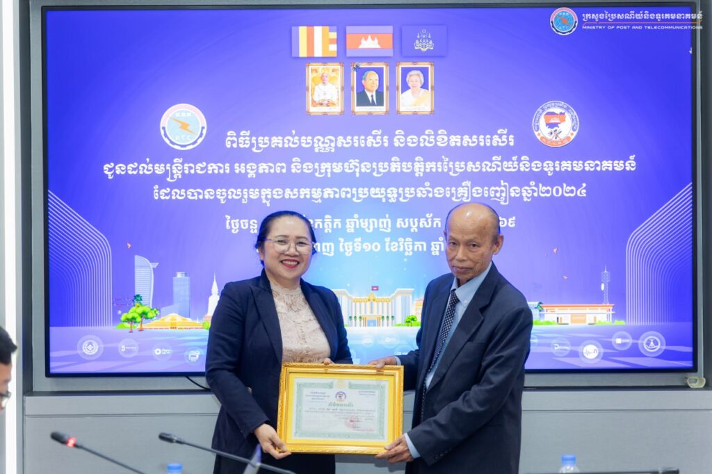 មុននឹងបញ្ចប់ ឯកឧត្តមរដ្ឋលេខាធិការ ក៏បានផ្តល់កិត្តិយសប្រគល់បណ្ណសរសើរ និងលិខិតសរសើរ ជូនមន្ត្រីរាជការ អង្គភាព និងក្រុមហ៊ុនប្រតិបត្តិករប្រៃសណីយ៍និងទូរគមនាគមន៍ ដែលបានចូលរួមក្នុងសកម្មភាពប្រយុទ្ធប្រឆាំងគ្រឿងញៀនឆ្នាំ២០២៤ កន្លងមក និងសង្ឃឹមថាបានទទួលការកោតសរសើរពីអាជ្ញាធរគ្រឿងញៀនក្នុងសកម្មភាពប្រយុទ្ធប្រឆាំងគ្រឿងញៀនឆ្នាំ២០២៥ ខាងមុខ។