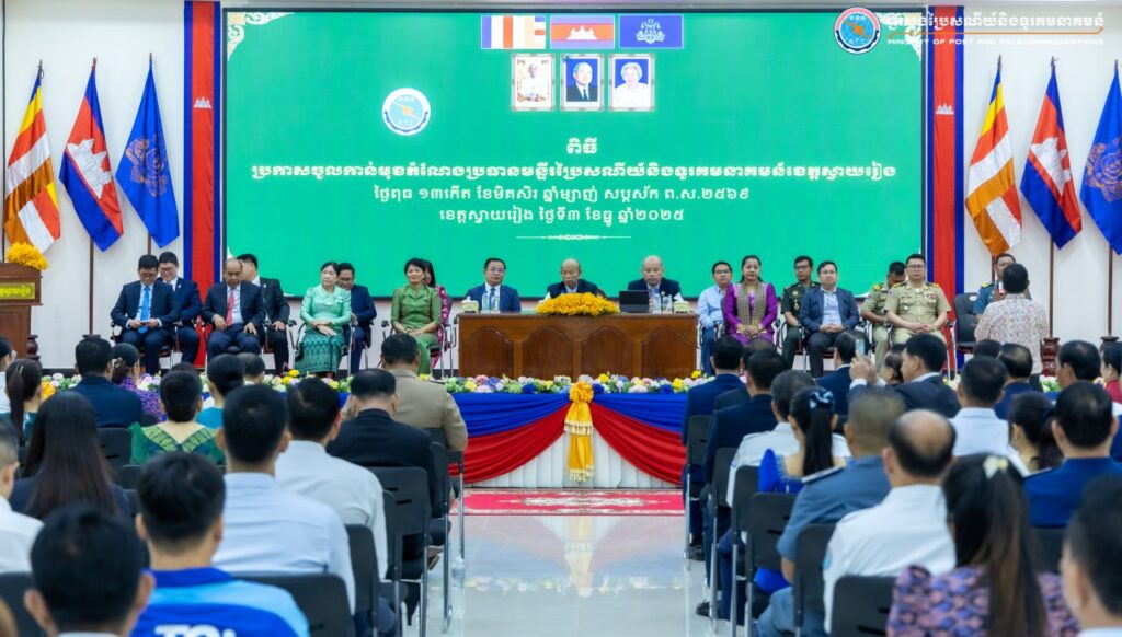 ខេត្តស្វាយរៀង៖ នៅព្រឹកថ្ងៃទី៣ ខែធ្នូ ឆ្នាំ២០២៥ នៅសាលាខេត្តស្វាយរៀង ឯកឧត្តម ខាយ ឃុនហេង រដ្ឋលេខាធិការក្រសួងប្រៃសណីយ៍និងទូរគមនាគមន៍ បានអញ្ជើញជាអធិបតីក្នុងពិធីប្រកាសតែងតាំងលោក សុខ សីហា ជាប្រធានថ្មី នៃមន្ទីរប្រៃសណីយ៍និងទូរគមនាគមន៍ខេត្តស្វាយរៀង ជំនួសលោក គង់ សេរីវុធ ដែលត្រូវបានដាក់ឱ្យចូលនិវត្តន៍។ កម្មវិធីនេះមានវត្តមានចូលរួមពីសំណាក់ ឯកឧត្តម ម៉ែន វិបុល ប្រធានក្រុមប្រឹក្សាខេត្ត ឯកឧត្តម ប៉េង ពោធិ៍សា អភិបាលនៃគណៈអភិបាលខេត្ត និង ឯកឧត្តម លោកជំទាវ លោក លោកស្រី ជាថ្នាក់ដឹកនាំ មន្ត្រីរាជការ នៃក្រសួងប្រៃសណីយ៍និងទូរគមនាគមន៍ ព្រមទាំងមន្ទីរ-ស្ថាប័នជុំវិញខេត្ត សរុបប្រមាណ ១៥០នាក់។