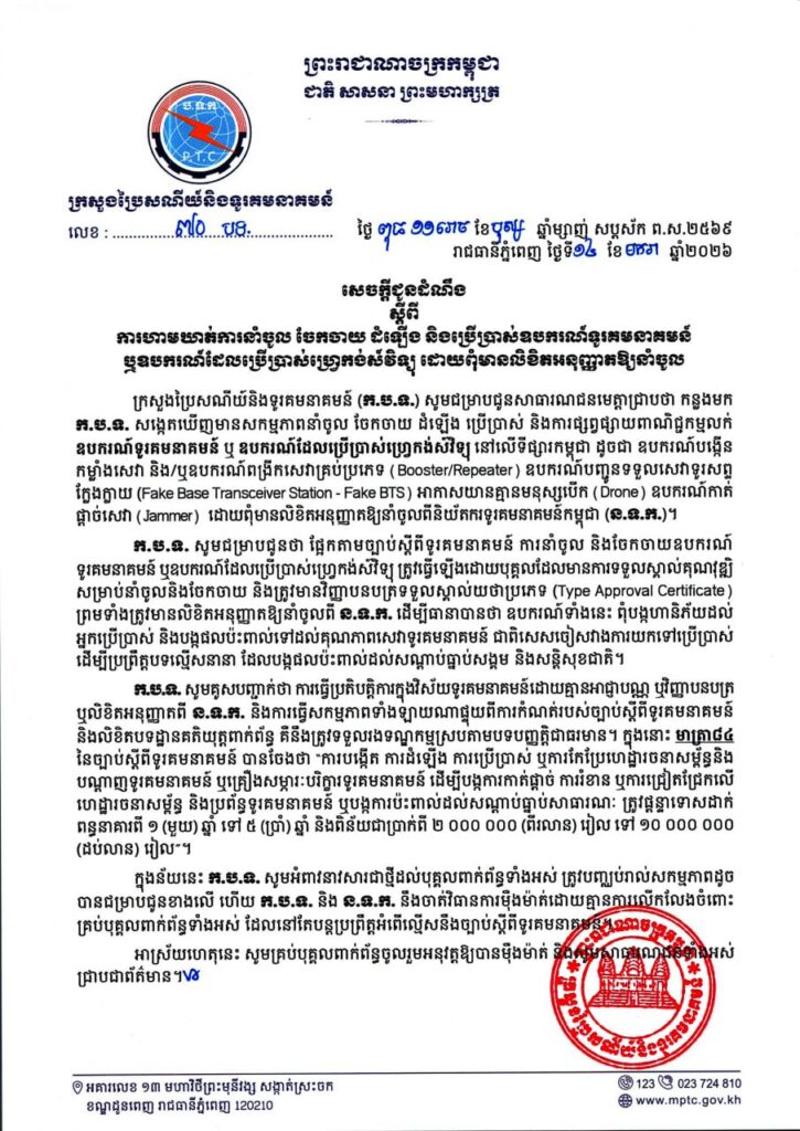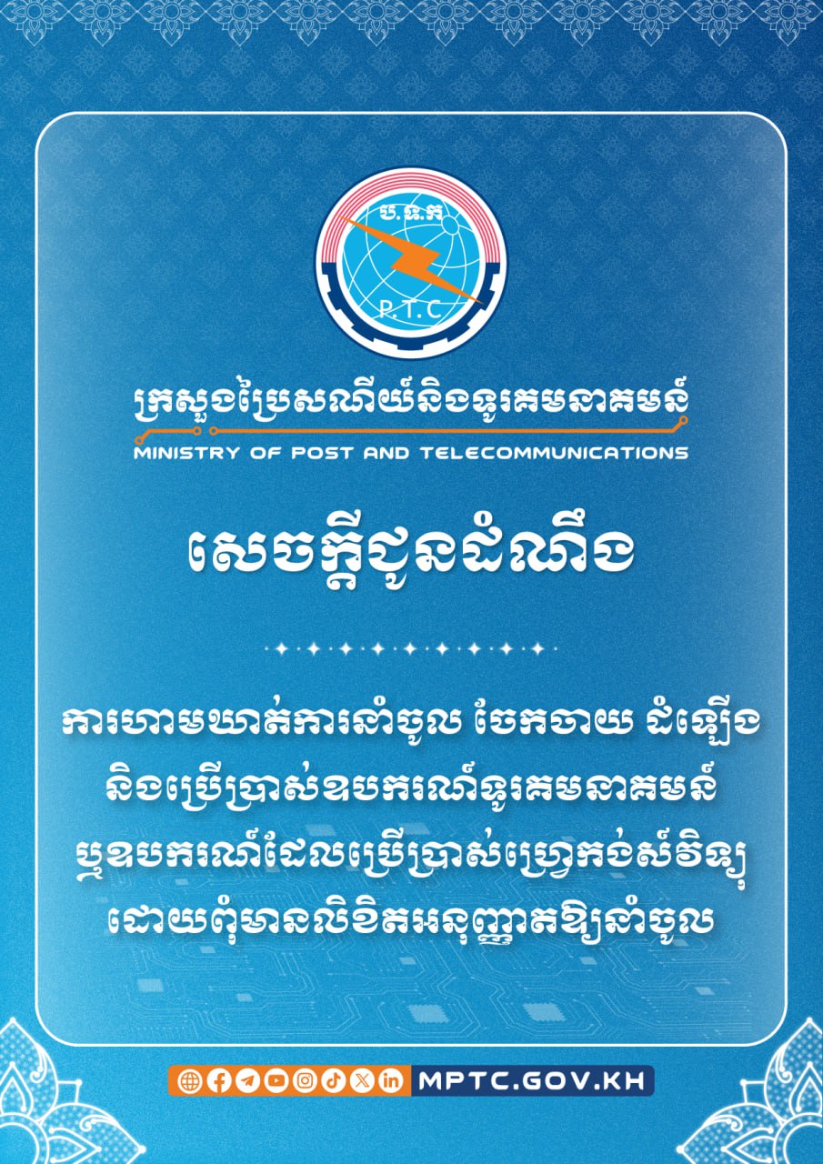 ក្រសួងប្រៃសណីយ៍និងទូរគមនាគមន៍ (ក.ប.ទ.) សូមជម្រាបជូនសាធារណជនមេត្តាជ្រាបថា កន្លងមក ក.ប.ទ. សង្កេតឃើញមានសកម្មភាពនាំចូល ចែកចាយ ដំឡើង ប្រើប្រាស់ និងការផ្សព្វផ្សាយពាណិជ្ជកម្មលក់ឧបករណ៍ទូរគមនាគមន៍ ឬ ឧបករណ៍ដែលប្រើប្រាស់ហ្វ្រេកង់ស៍វិទ្យុ នៅលើទីផ្សារកម្ពុជា ដូចជា ឧបករណ៍បង្កើនកម្លាំងសេវា និង/ឬឧបករណ៍ពង្រីកសេវាគ្រប់ប្រភេទ (Booster/Repeater) ឧបករណ៍បញ្ជូនទទួលសេវាទូរសព្ទក្លែងក្លាយ (Fake Base Transceiver Station – Fake BTS) អាកាសយានគ្មានមនុស្សបើក (Drone) ឧបករណ៍កាត់ផ្តាច់សេវា (Jammer) ដោយពុំមានលិខិតអនុញ្ញាតឱ្យនាំចូលពីនិយ័តករទូរគមនាគមន៍កម្ពុជា (ន.ទ.ក.)។
