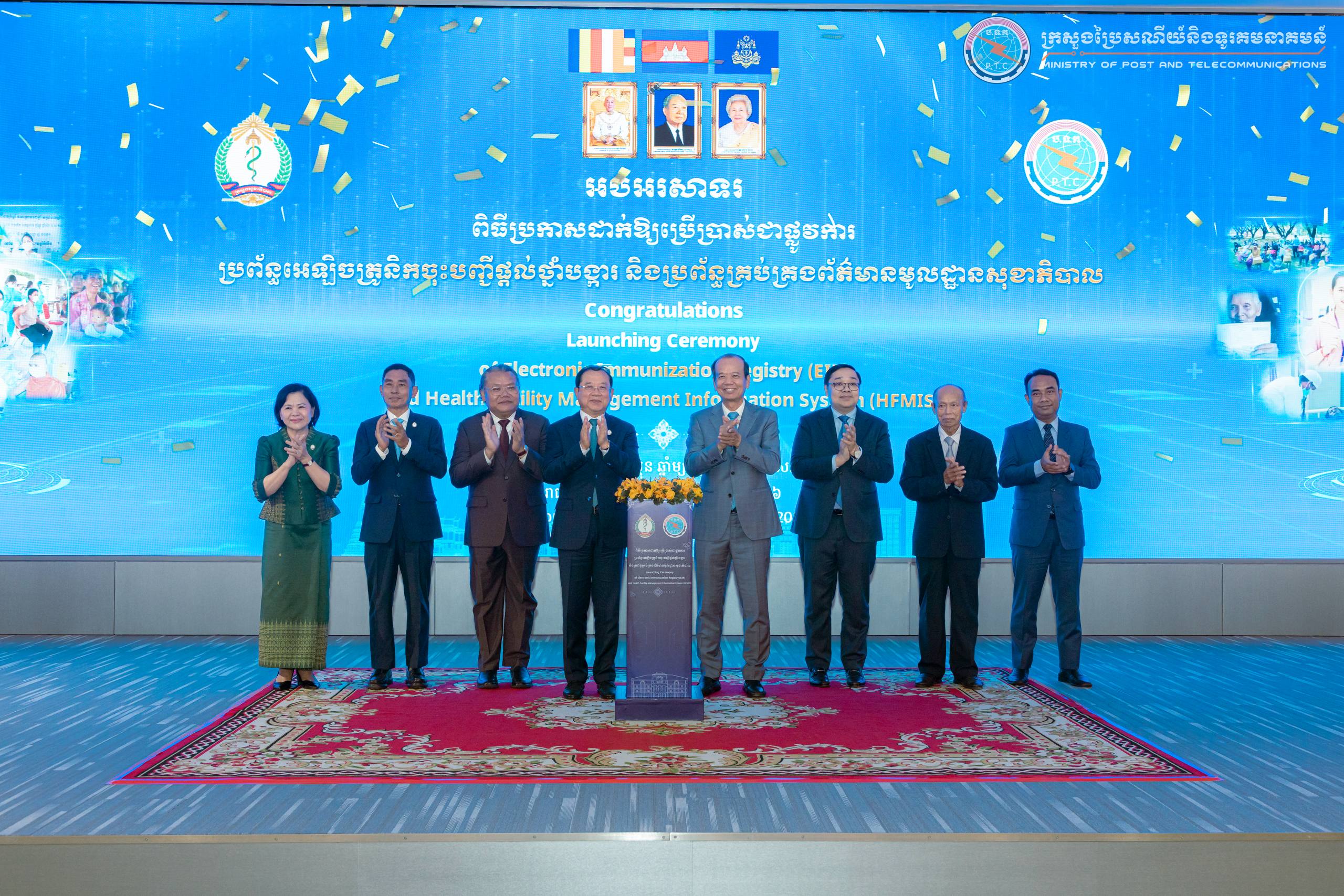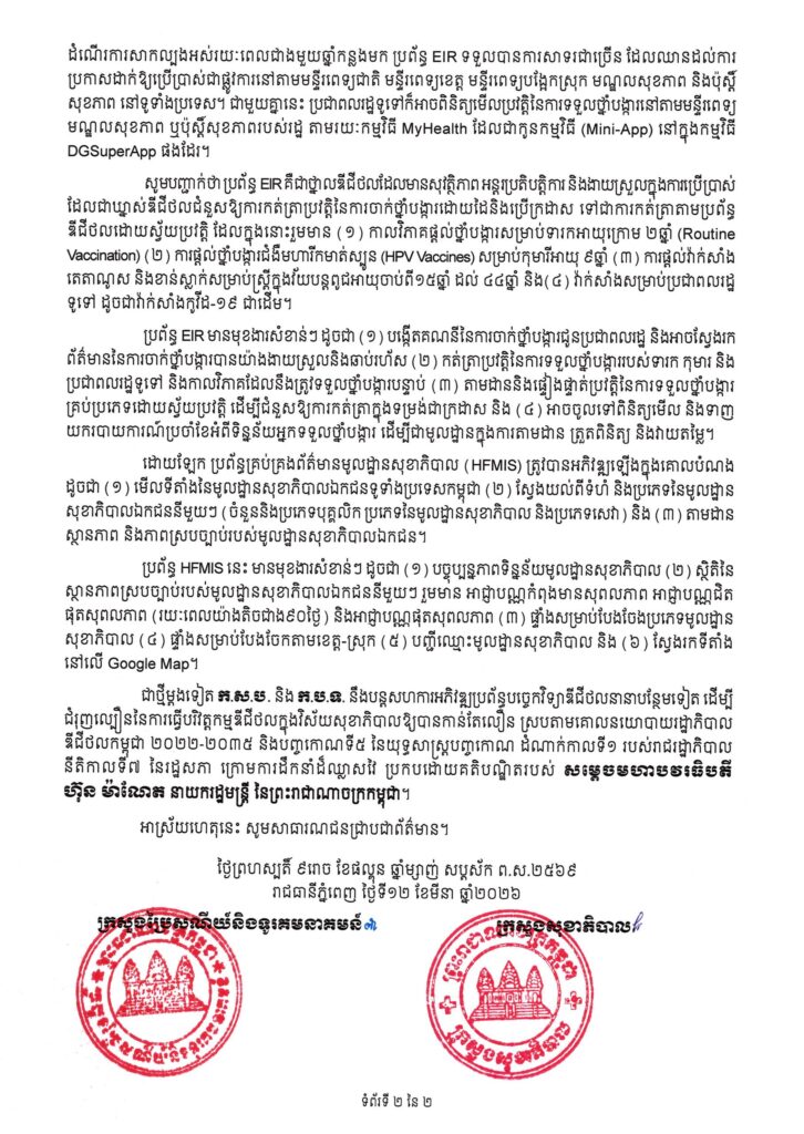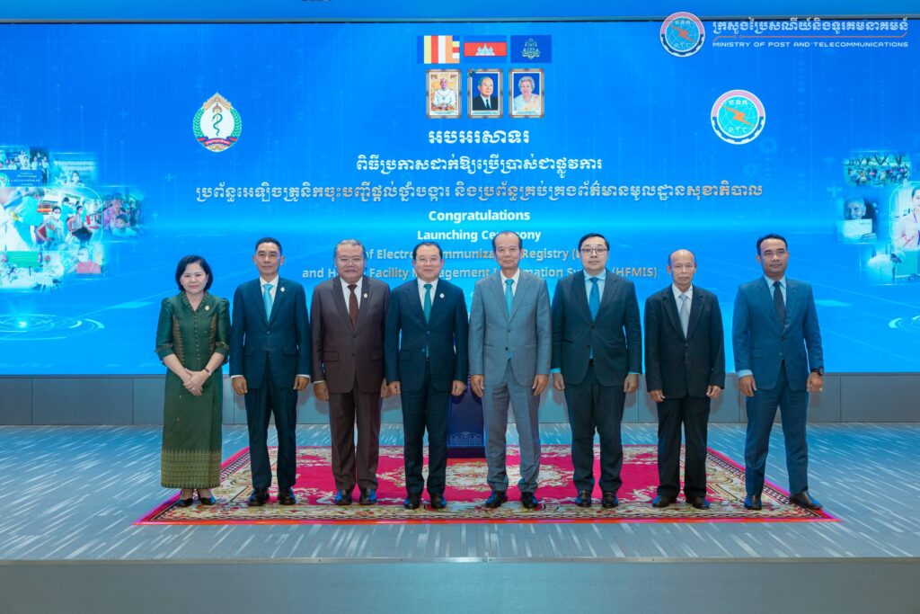 នារសៀលថ្ងៃព្រហស្បតិ៍ ៩រោច ខែផល្គុន ឆ្នាំម្សាញ់ សប្តស័ក ព.ស.២៥៦៩ ត្រូវនឹងថ្ងៃទី១២ ខែមីនា ឆ្នាំ២០២៦ នៅទីស្ដីការក្រសួងប្រៃសណីយ៍និងទូរគមនាគមន៍ (ក.ប.ទ.) ឯកឧត្ដម ជា វ៉ាន់ដេត រដ្ឋមន្ត្រី ក.ប.ទ. និងឯកឧត្តមសាស្រ្តាចារ្យ ឈាង រ៉ា រដ្ឋមន្ត្រីក្រសួងសុខាភិបាល (ក.ស.ប.) បានអញ្ជើញជាគណៈអធិបតីក្នុង “ពិធីប្រកាសដាក់ឱ្យប្រើប្រាស់ជាផ្លូវការប្រព័ន្ធអេឡិចត្រូនិកចុះបញ្ជីផ្តល់ថ្នាំបង្ការ (EIR) និងប្រព័ន្ធគ្រប់គ្រងព័ត៌មានមូលដ្ឋានសុខាភិបាល (HFMIS)”។