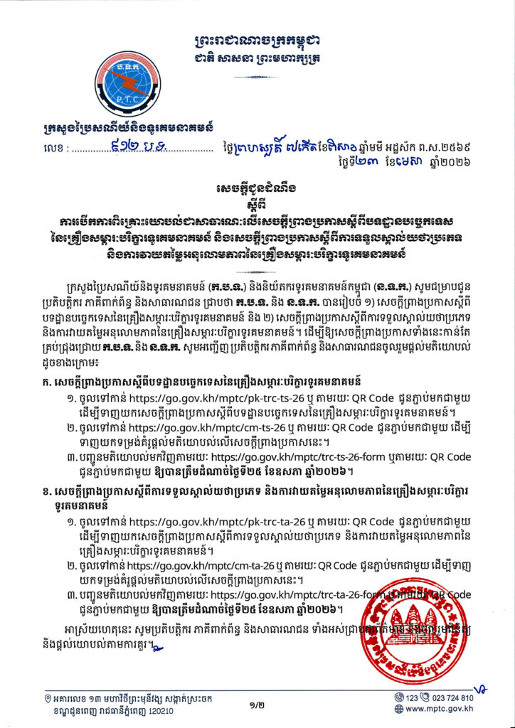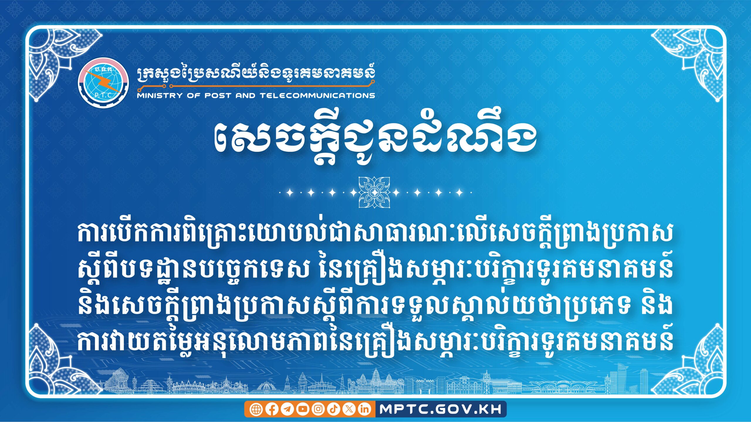 ក្រសួងប្រៃសណីយ៍និងទូរគមនាគមន៍ (ក.ប.ទ.) និងនិយ័តករទូរគមនាគមន៍កម្ពុជា (ន.ទ.ក.) សូមជម្រាបជូនប្រតិបត្តិករ ភាគីពាក់ព័ន្ធ និងសាធារណជន ជ្រាបថា ក.ប.ទ. និង ន.ទ.ក. បានរៀបចំ ១) សេចក្តីព្រាងប្រកាសស្តីពីបទដ្ឋានបច្ចេកទេសនៃគ្រឿងសម្ភារៈបរិក្ខារទូរគមនាគមន៍ និង ២) សេចក្តីព្រាងប្រកាសស្តីពីការទទួលស្គាល់យថាប្រភេទ និងការវាយតម្លៃអនុលោមភាពនៃគ្រឿងសម្ភារៈបរិក្ខារទូរគមនាគមន៍។ ដើម្បីឱ្យសេចក្តីព្រាងប្រកាសទាំងនេះកាន់តែគ្រប់ជ្រុងជ្រោយ ក.ប.ទ. និង ន.ទ.ក. សូមអញ្ជើញ ប្រតិបត្តិករ ភាគីពាក់ព័ន្ធ និងសាធារណជនចូលរួមផ្តល់មតិយោបល់ដូចខាងក្រោម៖