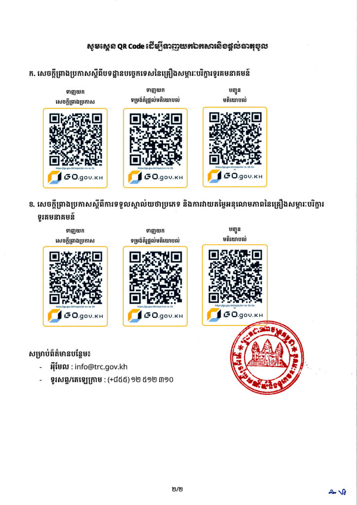 1. ចូលទៅកាន់ https://go.gov.kh/mptc/pk-trc-ts-26 ឬ តាមរយៈ QR Code ជូនភ្ជាប់មកជាមួយ ដើម្បីទាញយកសេចក្តីព្រាងប្រកាសស្តីពីបទដ្ឋានបច្ចេកទេសនៃគ្រឿងសម្ភារៈបរិក្ខារទូរគមនាគមន៍។