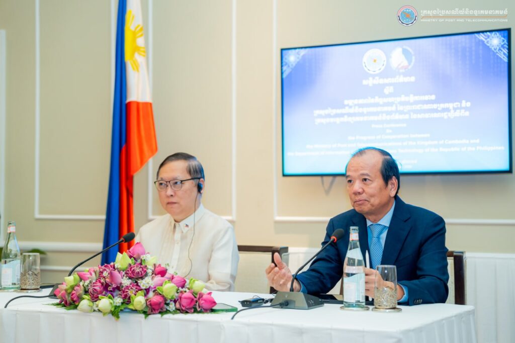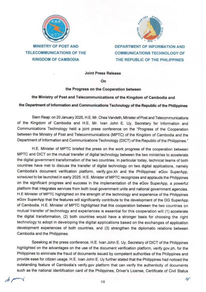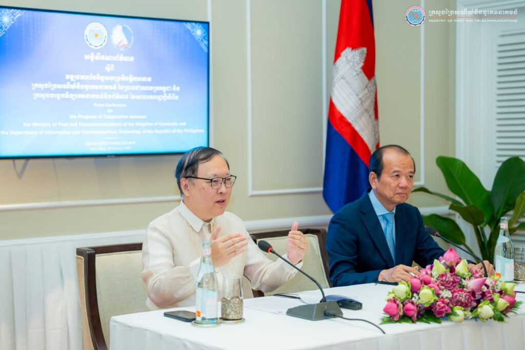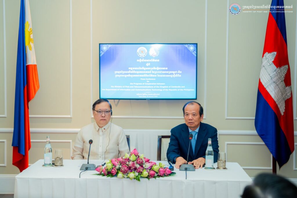Siem Reap: on 20 January 2025, H.E. Mr. Chea Vandeth, Minister of Post and Telecommunications of the Kingdom of Cambodia and H.E. Mr. Ivan John E. Uy, Secretary for Information and Communications Technology held a joint press conference on the “Progress of the Cooperation between the Ministry of Post and Telecommunications (MPTC) of the Kingdom of Cambodia and the Department of Information and Communications Technology (DICT) of the Republic of the Philippines.”