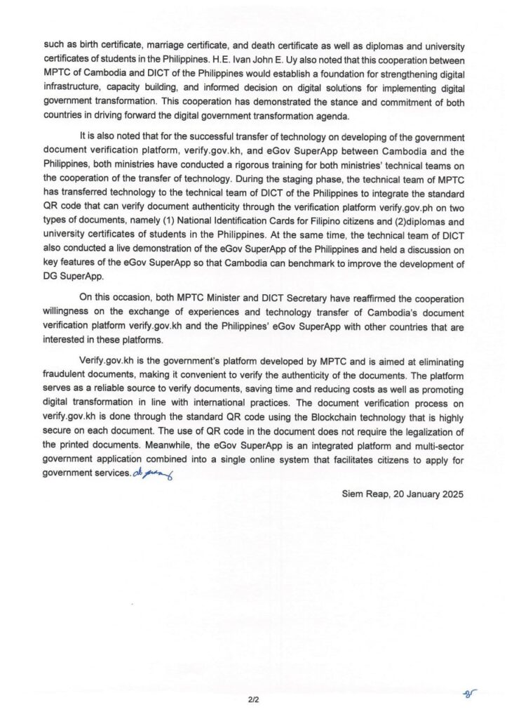 On this occasion, both MPTC Minister and DICT Secretary have reaffirmed the cooperation willingness on the exchange of experiences and technology transfer of Cambodia’s document verification platform verify.gov.kh and the Philippines’ eGov SuperApp with other countries that are interested in these platforms.