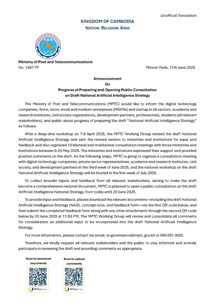 For more information, please contact via email: ai-governance@mptc.gov.kh or 096 651 3003.