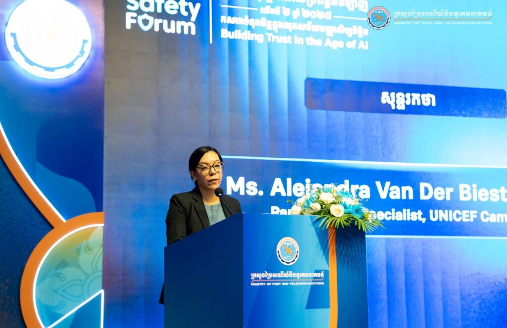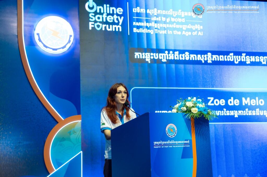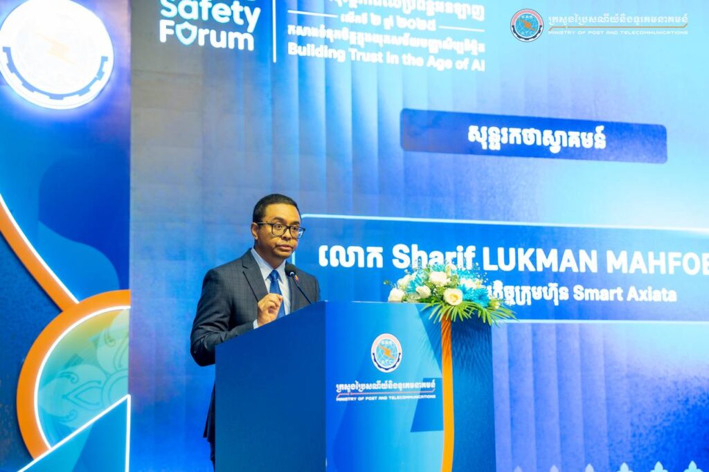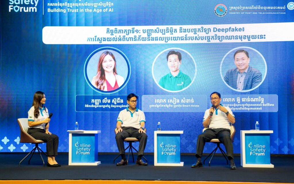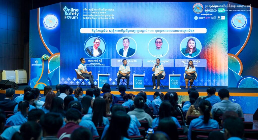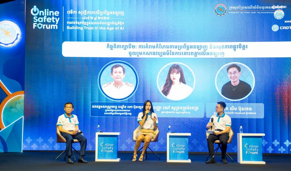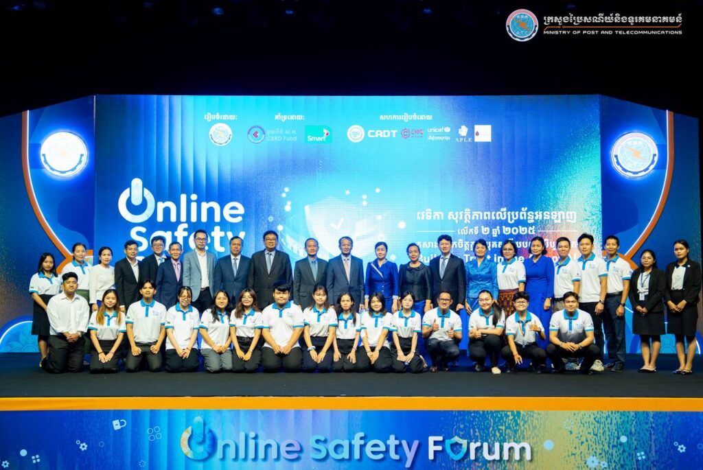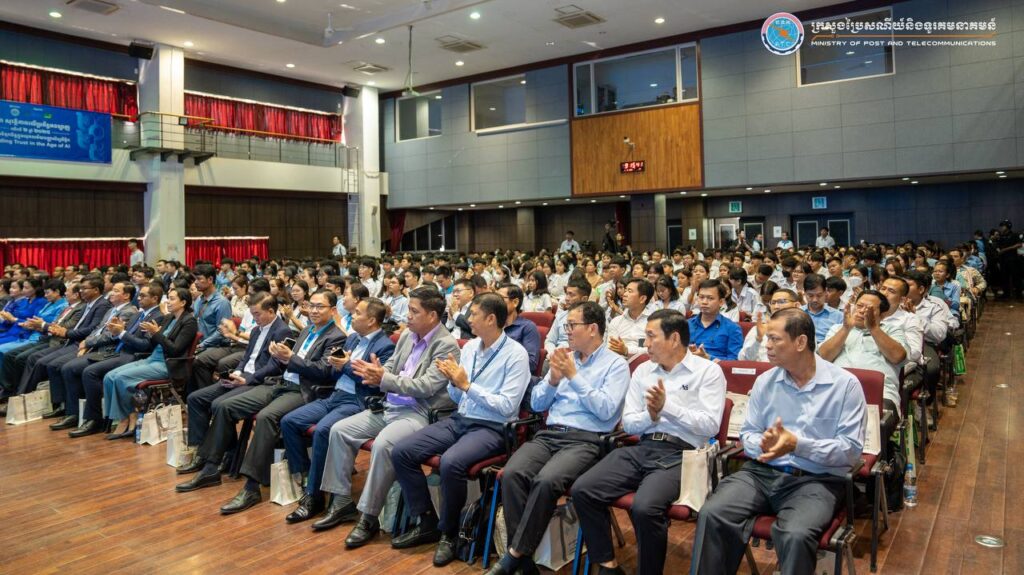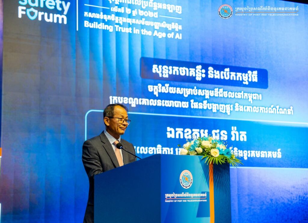 Phnom Penh— On August 1, 2025, His Excellency Chun Vat, Secretary of State at the Ministry of Post and Telecommunications, presided over the Online Safety Forum 2025 under the theme “Building Trust in the Age of AI,” held at the Cambodia-Korea Cooperation Center (CKCC) within the Royal University of Phnom Penh. The forum gathered approximately 600 participants, including representatives from ministries and institutions, development partners, technology companies, civil society organizations, academic institutions, teachers, students, and the general public.