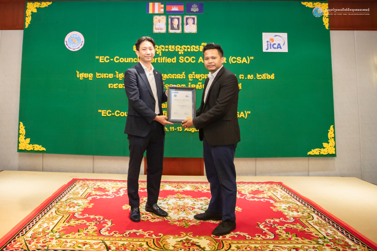 Phnom Penh— On August 13, 2025, His Excellency Khov Makara, Secretary of State of the Ministry of Post and Telecommunications, presided over the closing ceremony of the training on “EC-Council Certified SOC Analyst (CSA)” under the Cyber Resilience Improvement Project, which took place from August 11 to 13, 2025, at Himawari Hotel, Phnom Penh. The event brought together approximately 30 technical officials from various government ministries and institutions and relevant units.