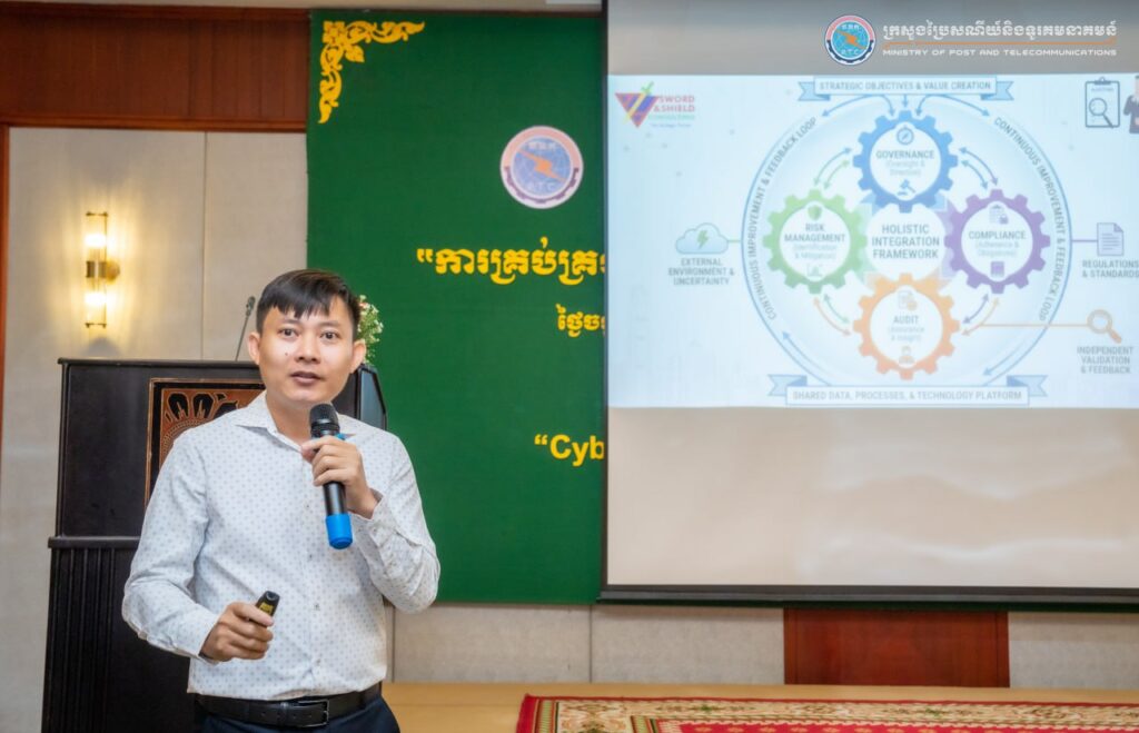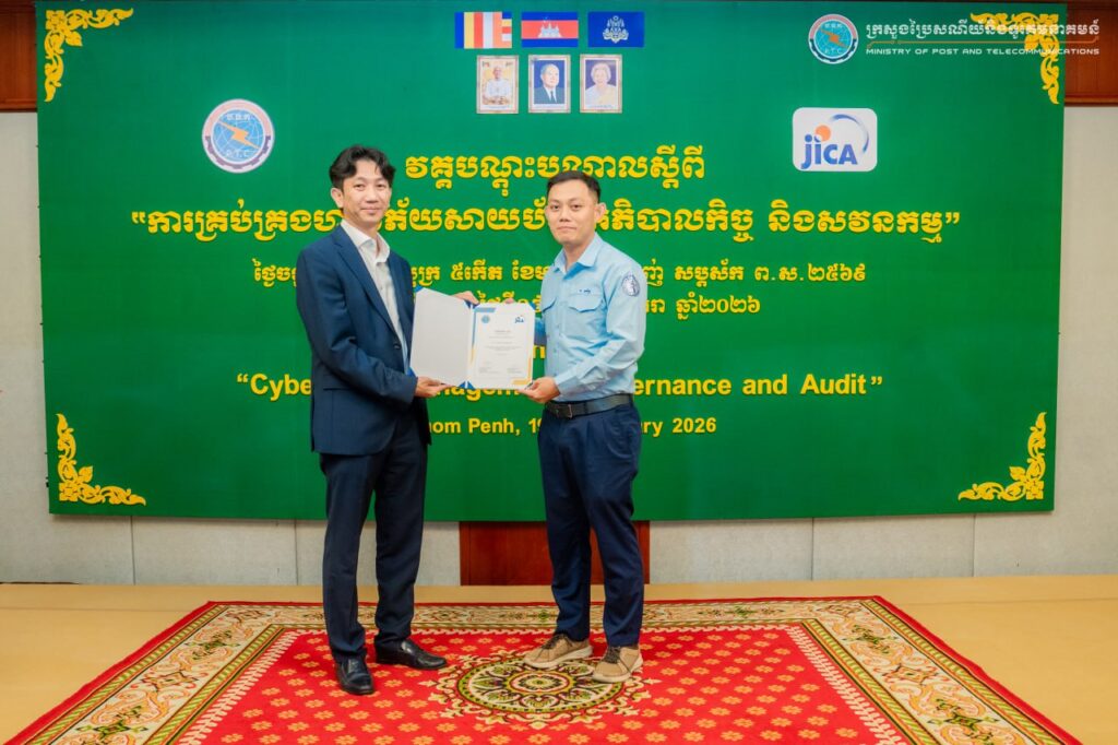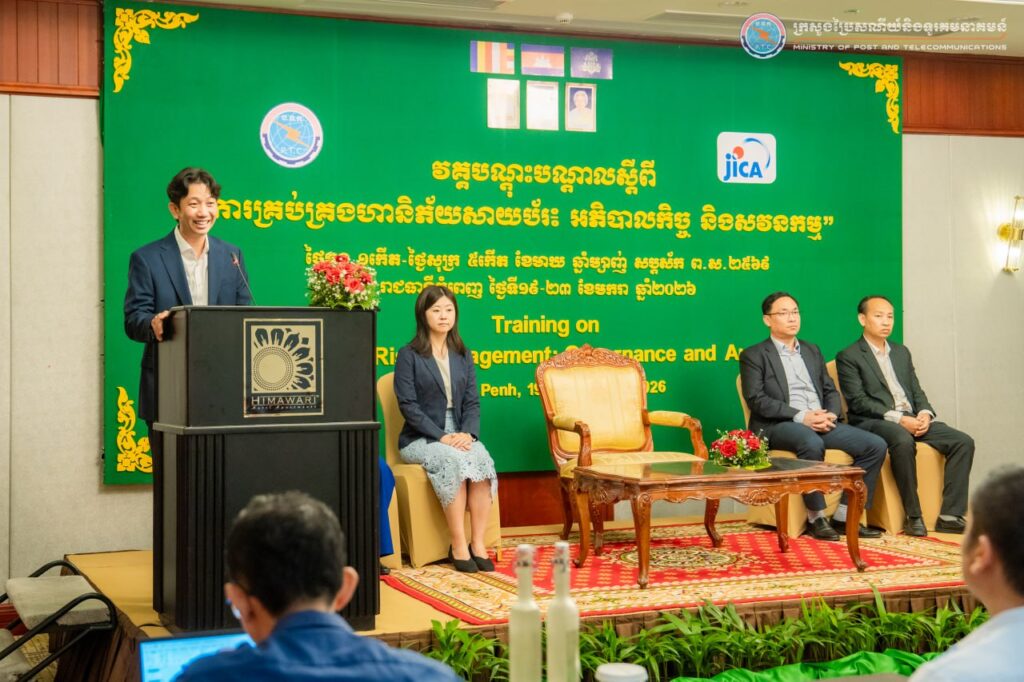 Phnom Penh—On the afternoon of January 23, 2026, His Excellency Khov Makara, Secretary of State of the Ministry of Post and Telecommunications, presided over the closing ceremony of the training course on “Cyber Risk Management: Governance and Audit,” held at Himawari Hotel in Phnom Penh, with the participation of officials and specialists from 35 relevant government ministries and public institutions, regulators, critical information infrastructure operators, internet service providers, and banks—bringing together approximately 50 participants.